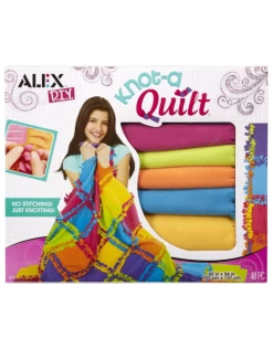 Alex DIY Knot-A-Quilt Kit is an easy way to instantly create a super soft quilt. There is absolutely no cutting, sewing or knitting involved! Simply tie the pre-cut fringe squares together one by one. The fleece squares come in 6 bright colors. Kids will be able to knot a 3.5 foot by 4.5 foot quilt in no time! Includes 48 fringed 9 inch squares.