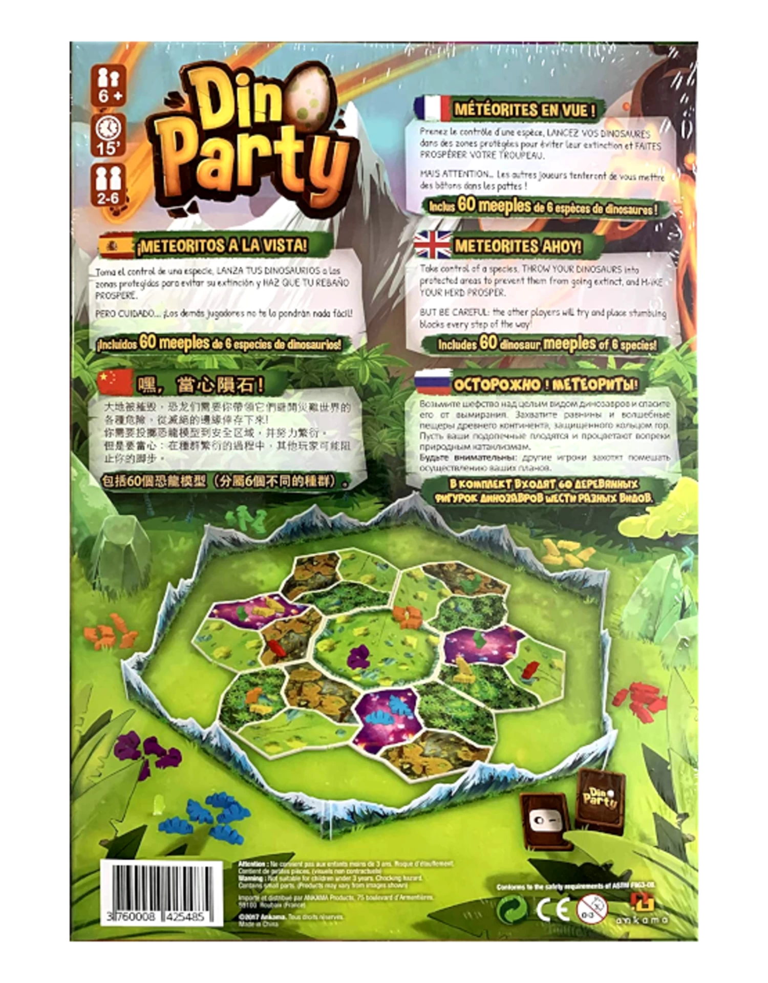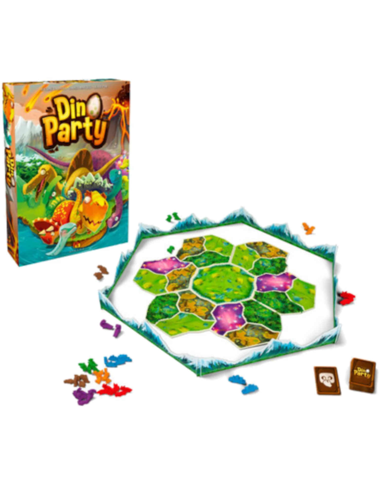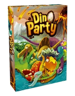 In Dino Party, each player adopts a species of dinosaur and attempts to save it from certain destruction by throwing adorable dinosaur meeples onto an ever-increasingly inhospitable board! Land them in the fields or caves, and you’ll have some happy dinos. Land them in the jungles or the ocean, and that may be the last you see of them. At the end of four rounds, the player who manages to save or create the most dinosaurs wins!