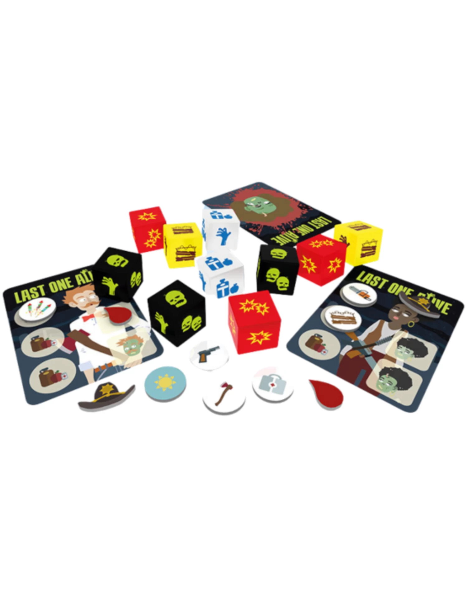 The zombie apocalypse has begun, will you be able to survive? Last One Alive is a fast and fun dice game for 2-5 players. Arm and barricade yourself, use that chainsaw, perform heroic feats… But most of all, try to get the zombies to kill the others before they kill you! Everything is allowed in order to be… the last one alive!