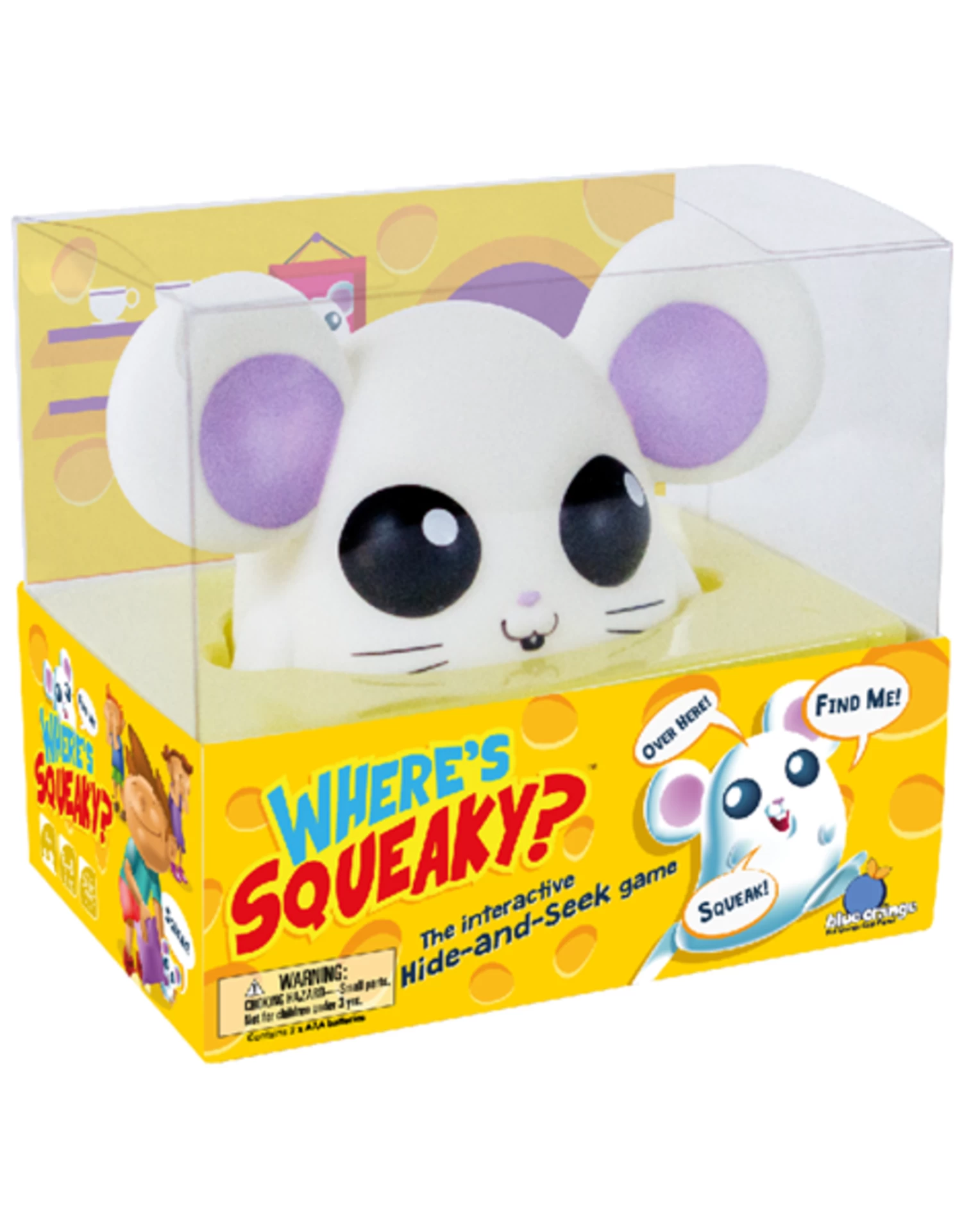 Can you find Squeaky the Mouse? One player hides her, and the rest of the players must find her! If you listen closely, you can hear her laughing and giggling louder and louder! Once you find the silly little mouse, return her back to her Cheese Box so she can finish her meal!