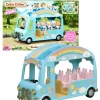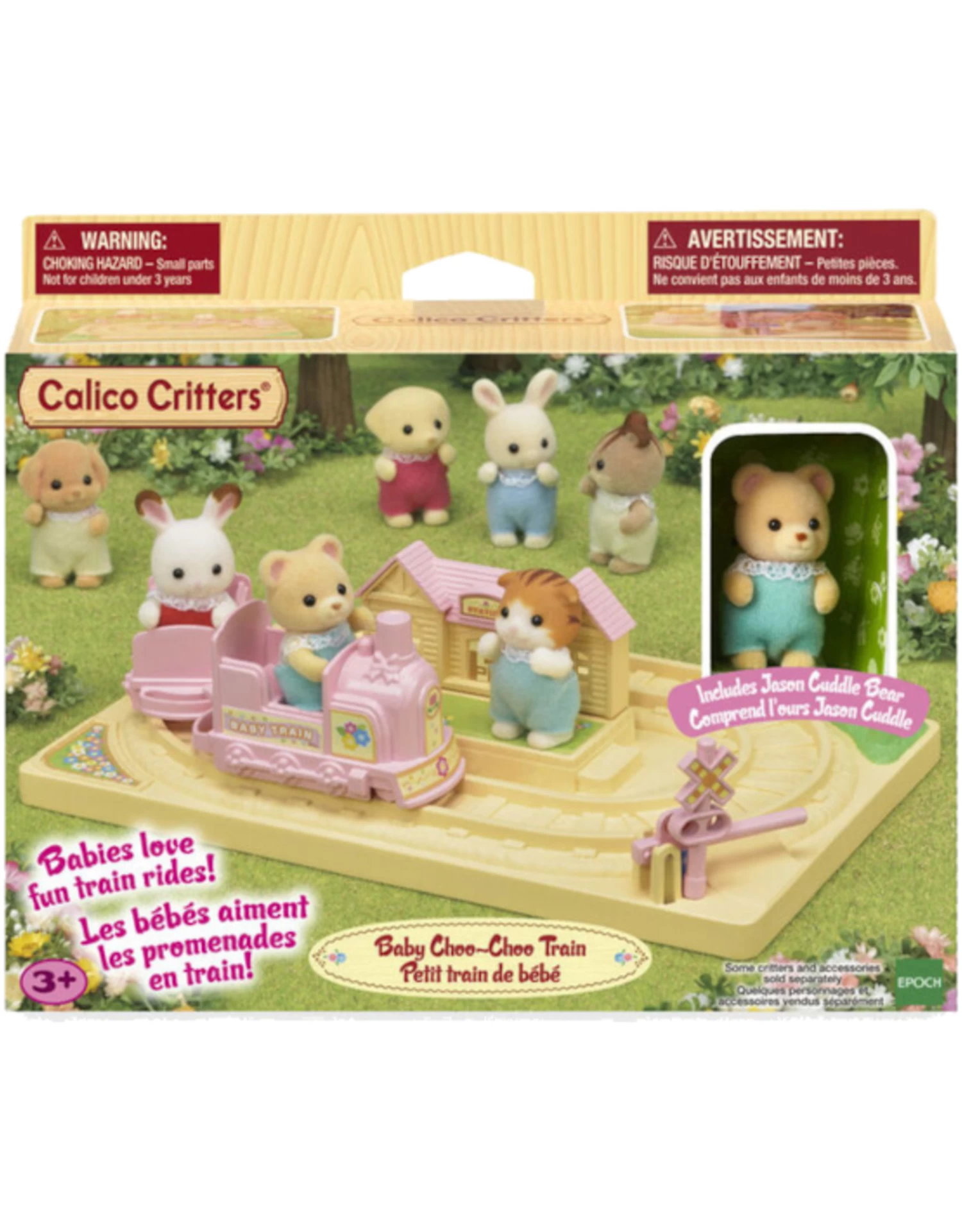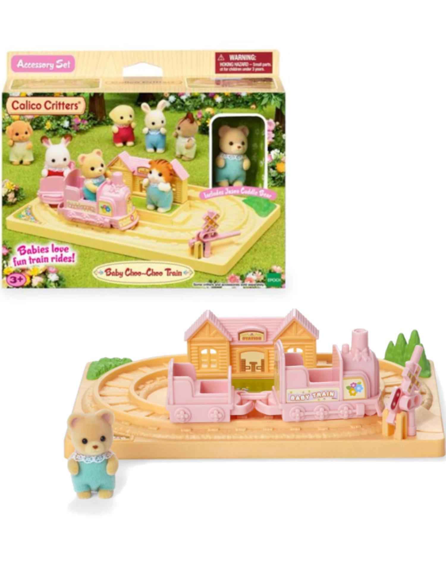 Baby Choo-Choo Train comes as a set with one Bear Baby figure. This playset is immediately ready for play as a stand-alone product. The two train cars can be pushed along the tracks by hand. One baby figure can fit in each train car. There’s also a railroad crossing with a movable gate.