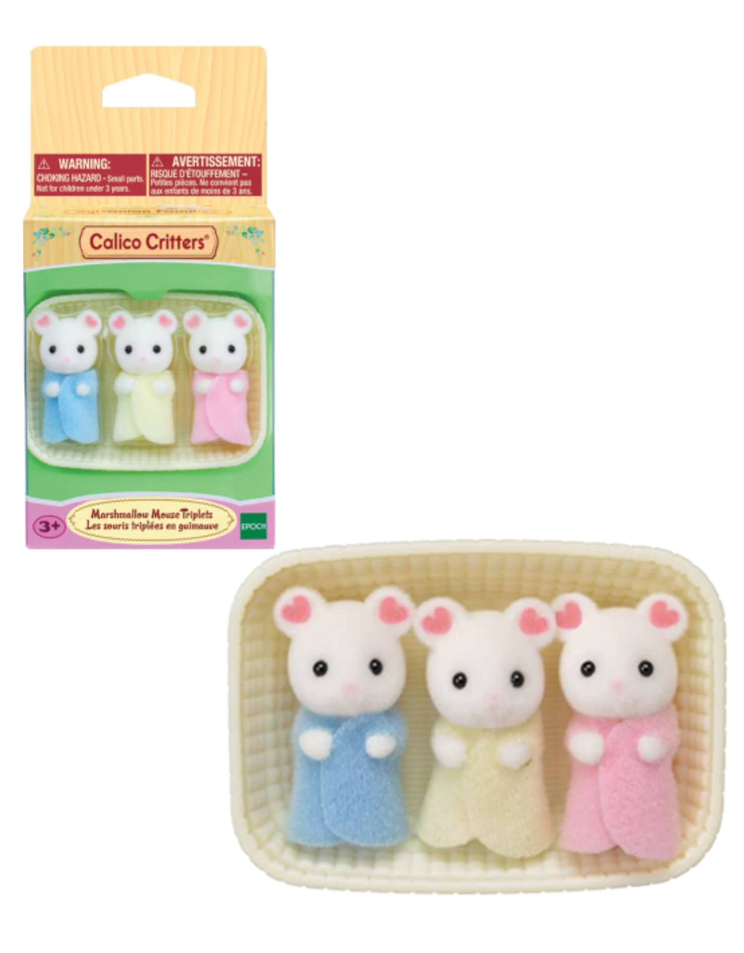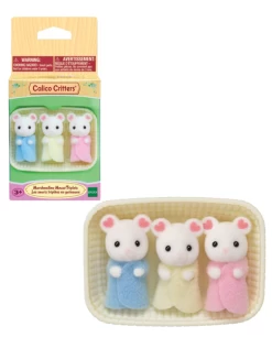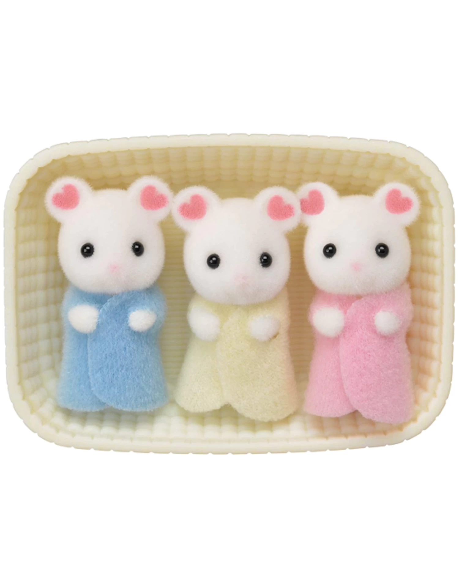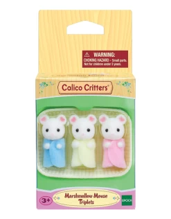 Marshmallow Mouse Triplets are characterized by flower petal patterns on their ears. This is the first time cradled triplets have made an appearance in Calico Critters.