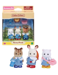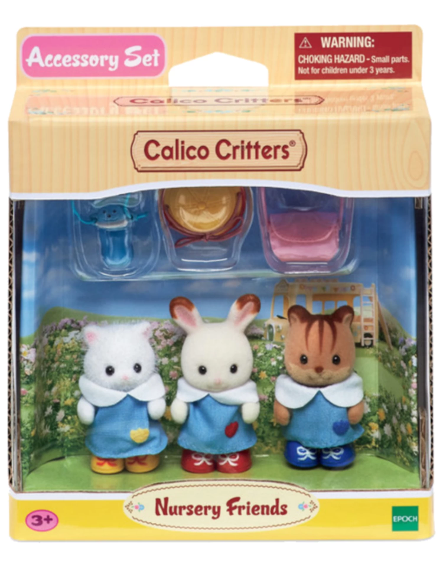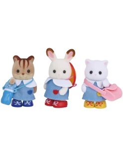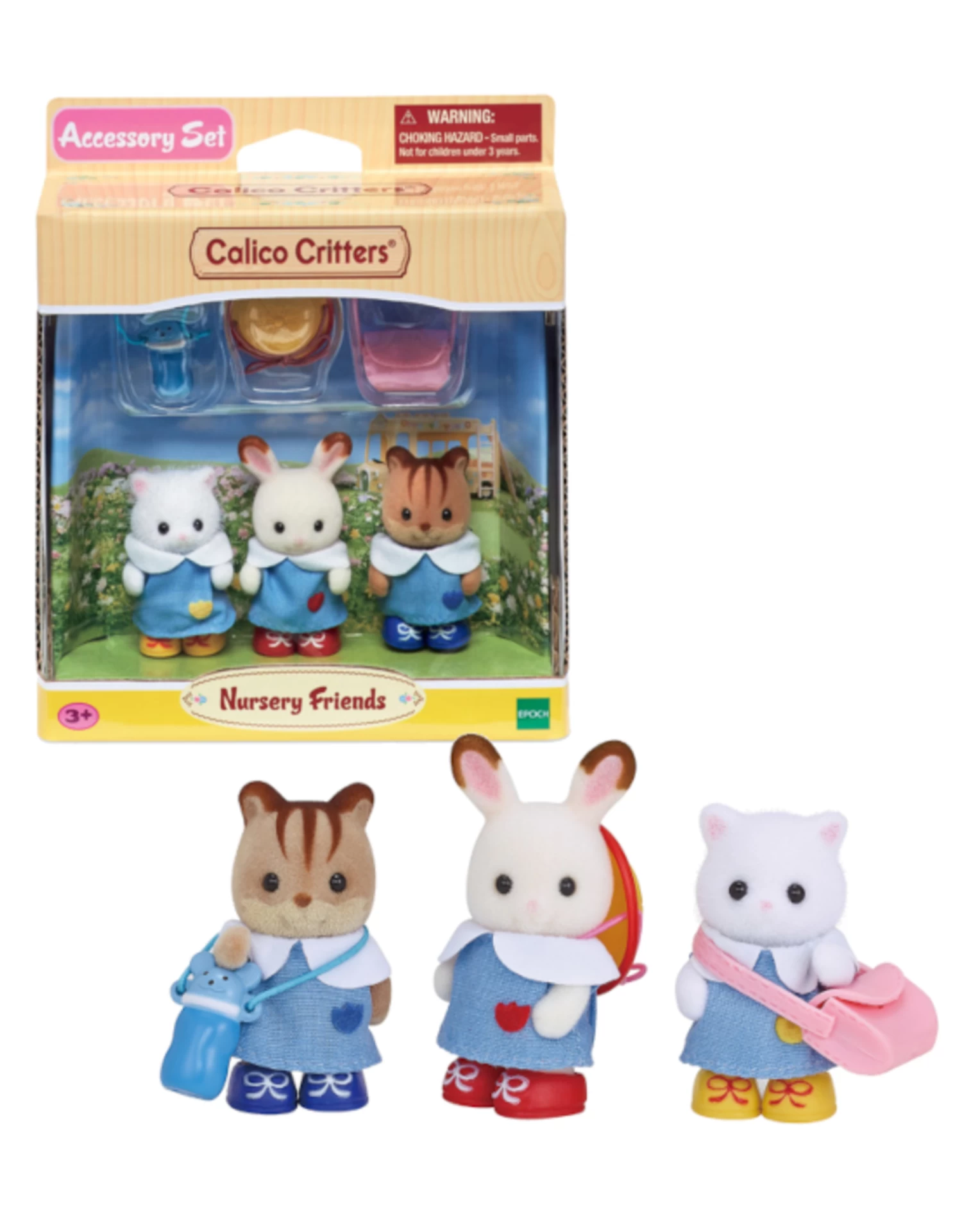 In this Nursery Friends set, the Hopscotch Rabbit baby, the Hazelnut Chipmunk baby and the Persian Cat baby are wearing adorable nursery clothes. Each baby wears an emblem in a different colour, with matching shoes. The set also includes a set of small items that the babies can wear or carry: a hat, a drink bottle and a nursery school bag.