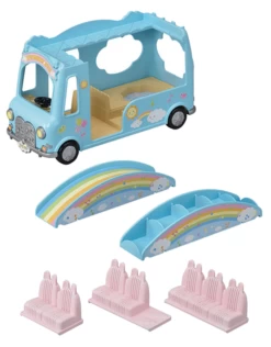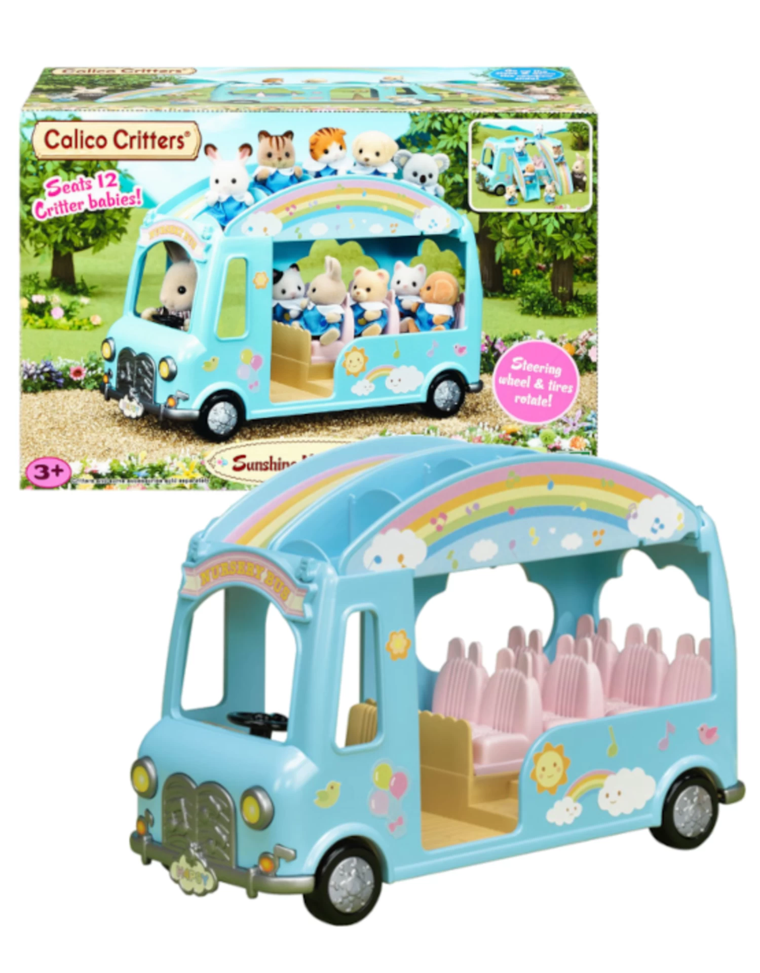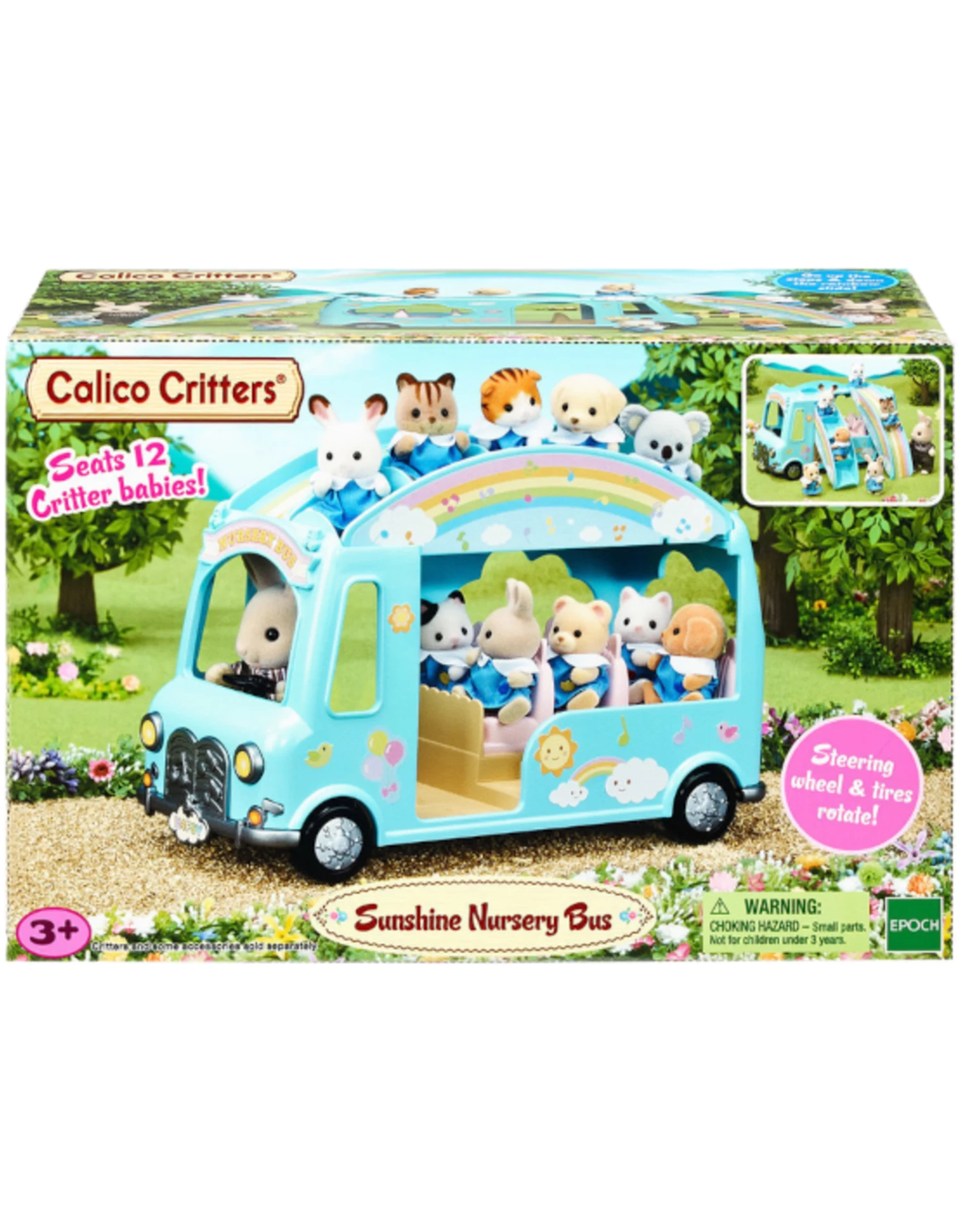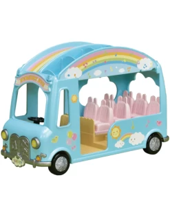 Sunshine Nursery Bus is a double-decker nursery school bus that seats up to 12 babies. It can be played with as a seesaw or slide by removing the seats. A pool is included inside the vehicle.