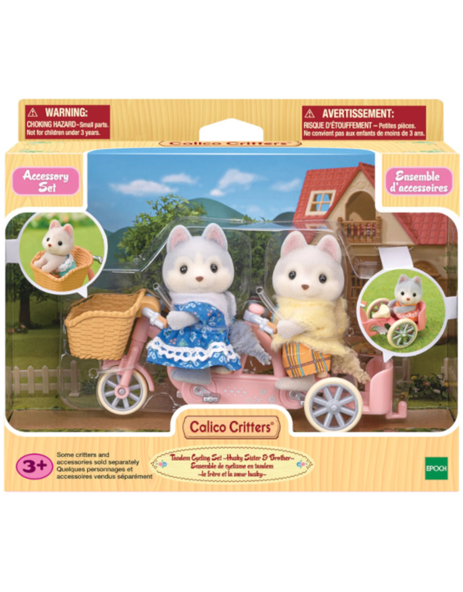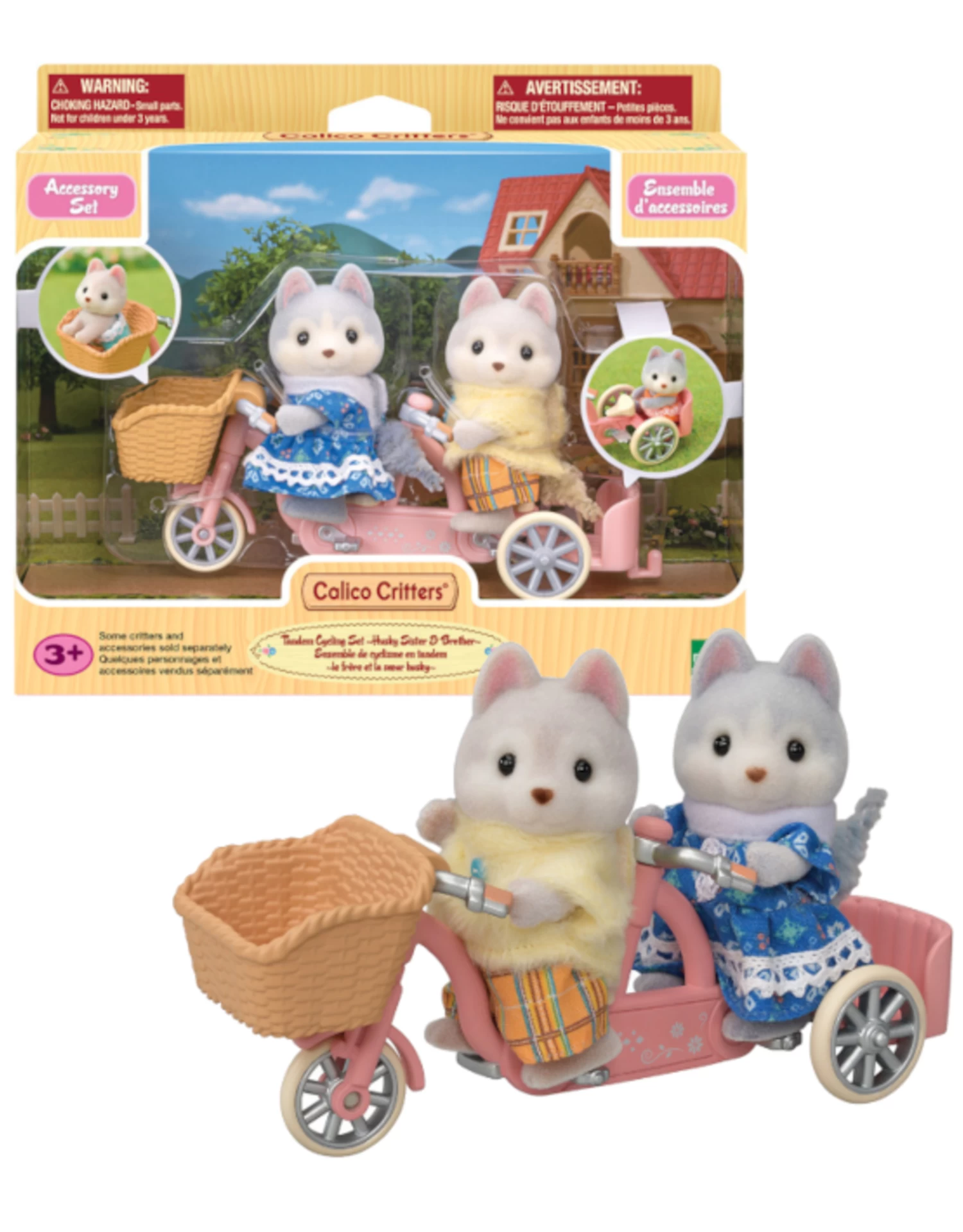 Calico Critters miniature dollhouses, playsets and figures are timeless and classic high-quality toys. This ready to play set includes 2 poseable figures in removeable clothing, along with tandem bicycle with rotating wheels, basket and pullcart for husky twins. Husky brother and sister Hayden and Pauline love to ride their bike through Calico Village! Pauline is full of energy and loves to go as fast as she can, but Hayden prefers to go slower so that he can see all the beautiful flowers and unusual trees along the way. What do you think they’ll see today?