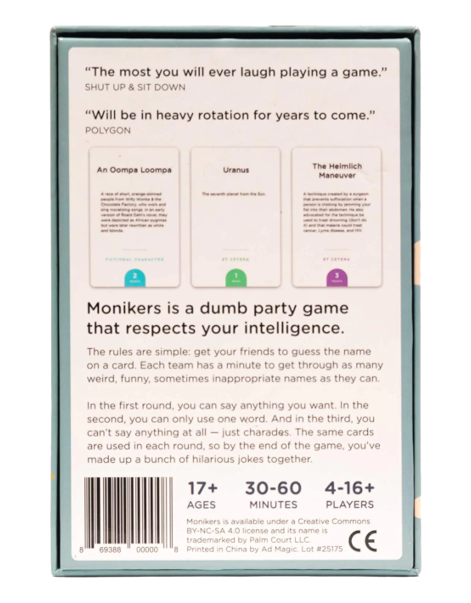 Monikers is a party game based on the public domain game Celebrity, where players take turns attempting to get their teammates to guess names by describing or imitating well-known people.