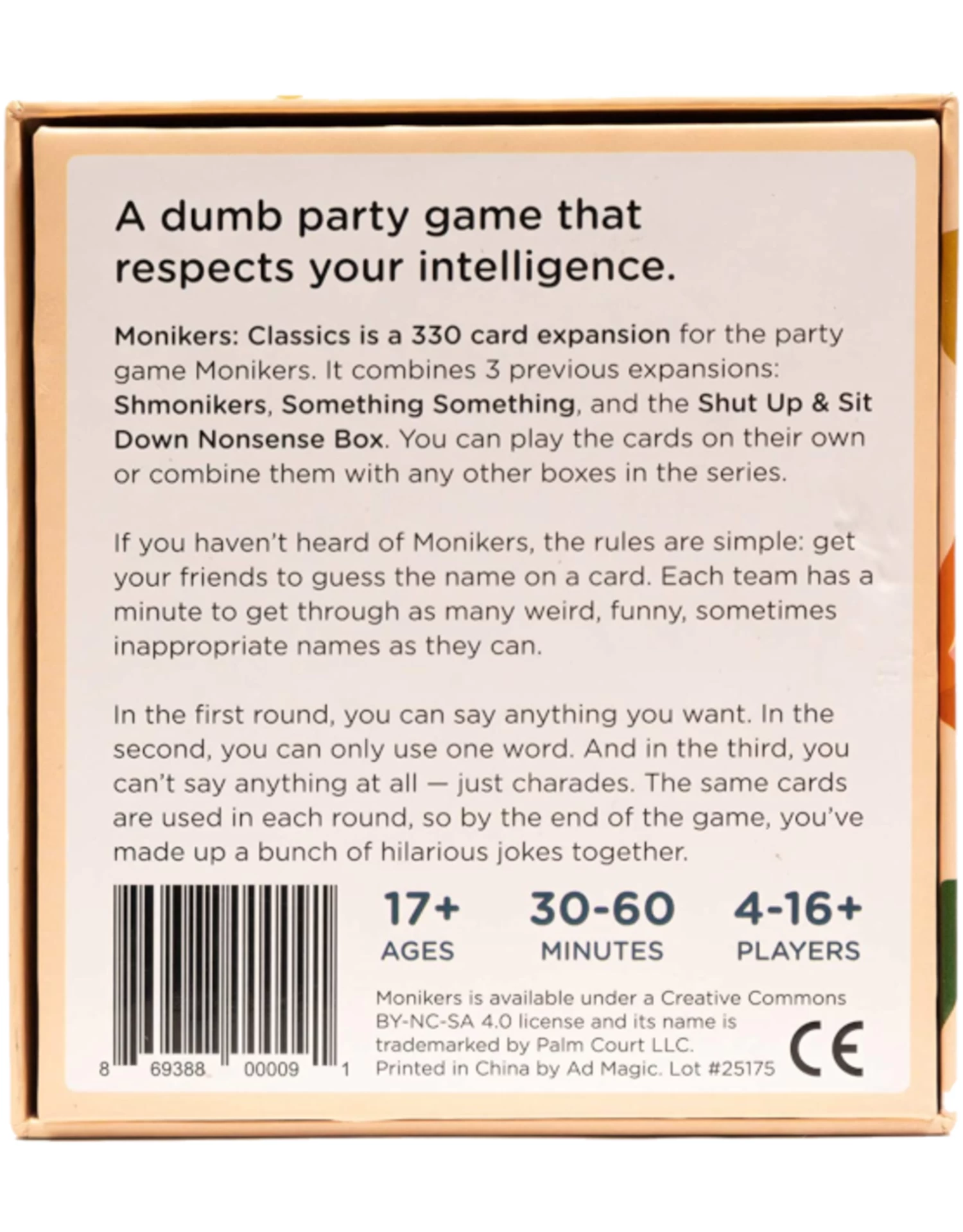 Monikers: Classics – This box combines all the previous small box stand alone expansions: Monikers: Shmonikers, Monikers: Something Something, and Monikers: The Shut Up & Sit Down Nonsense Box