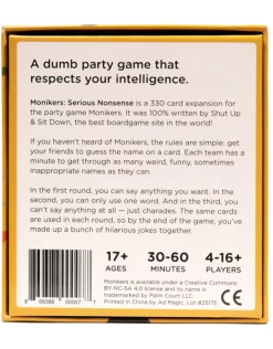 The Shut Up & Sit Down Nonsense Box is a standalone expansion for Monikers. It features 112 cards, written by the folks at Shut Up & Sit Down.