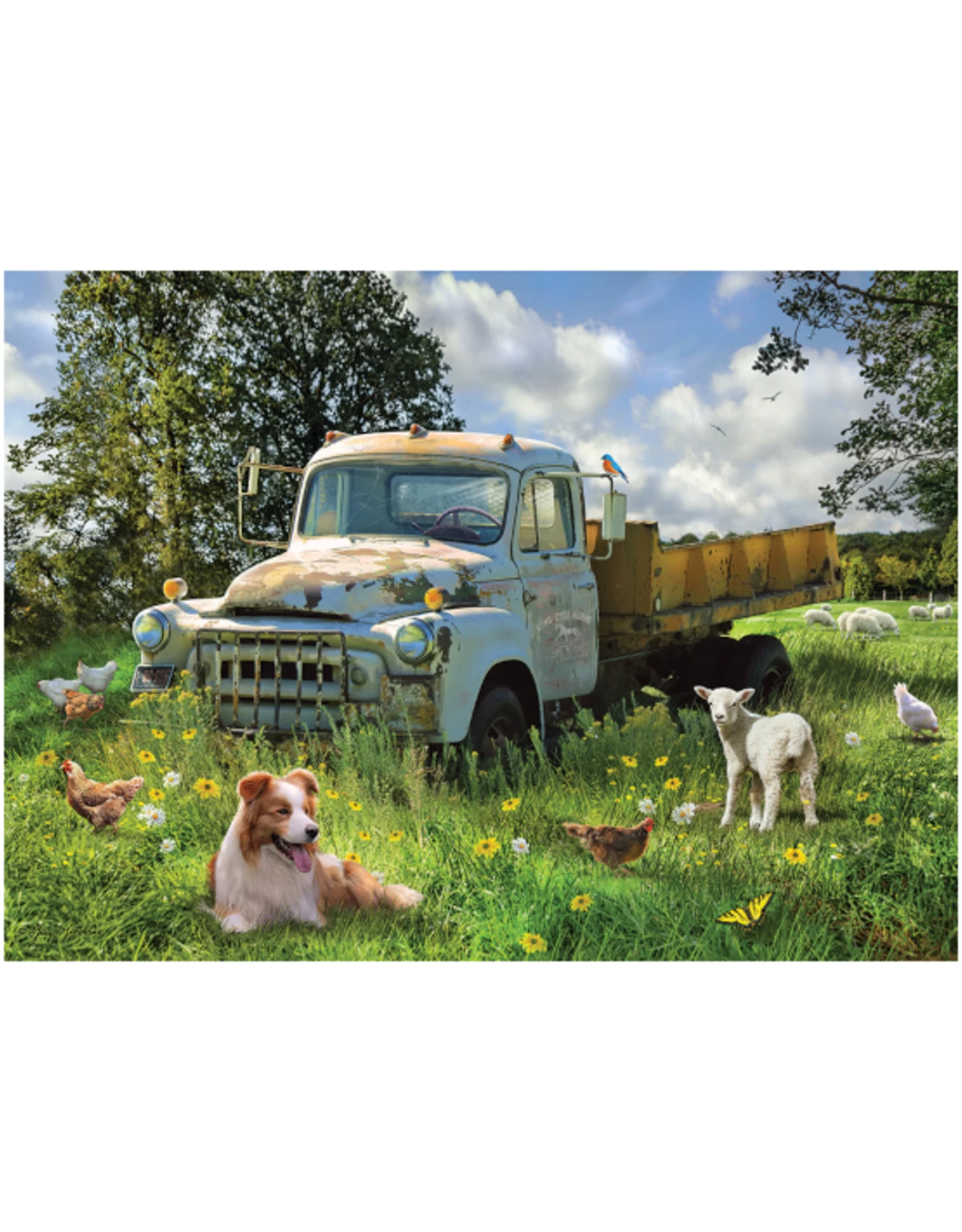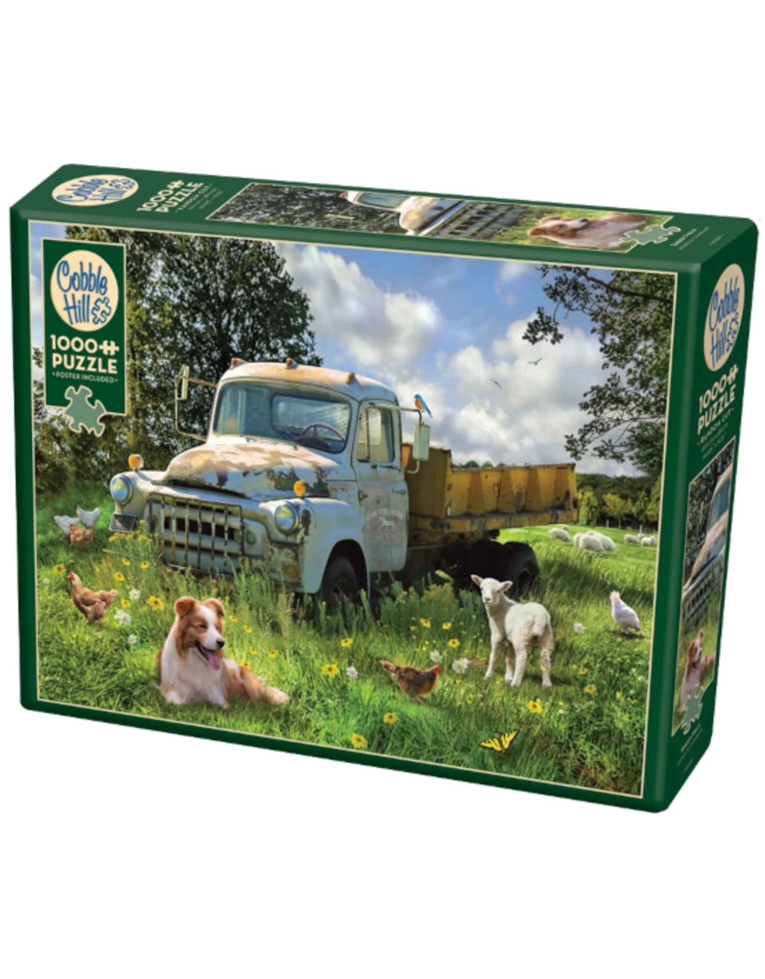 Harry the dog is enjoying a lovely day in the Sheep Field, joined by chickens, birds and butterflies, as he waits to take a ride in the vintage truck with his owner. Take an adventure with Cobble Hill’s 1000 piece random cut puzzle that includes a reference poster.