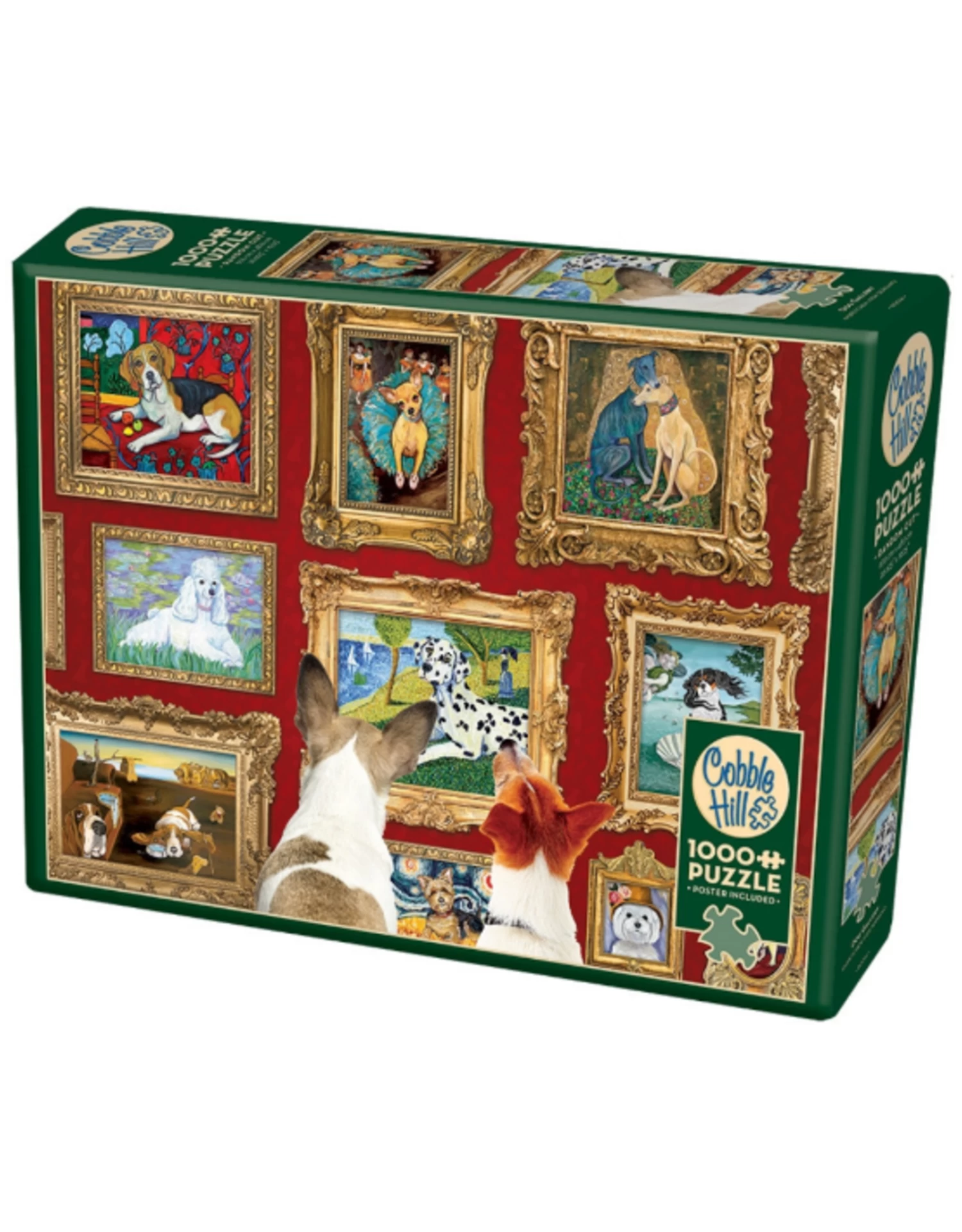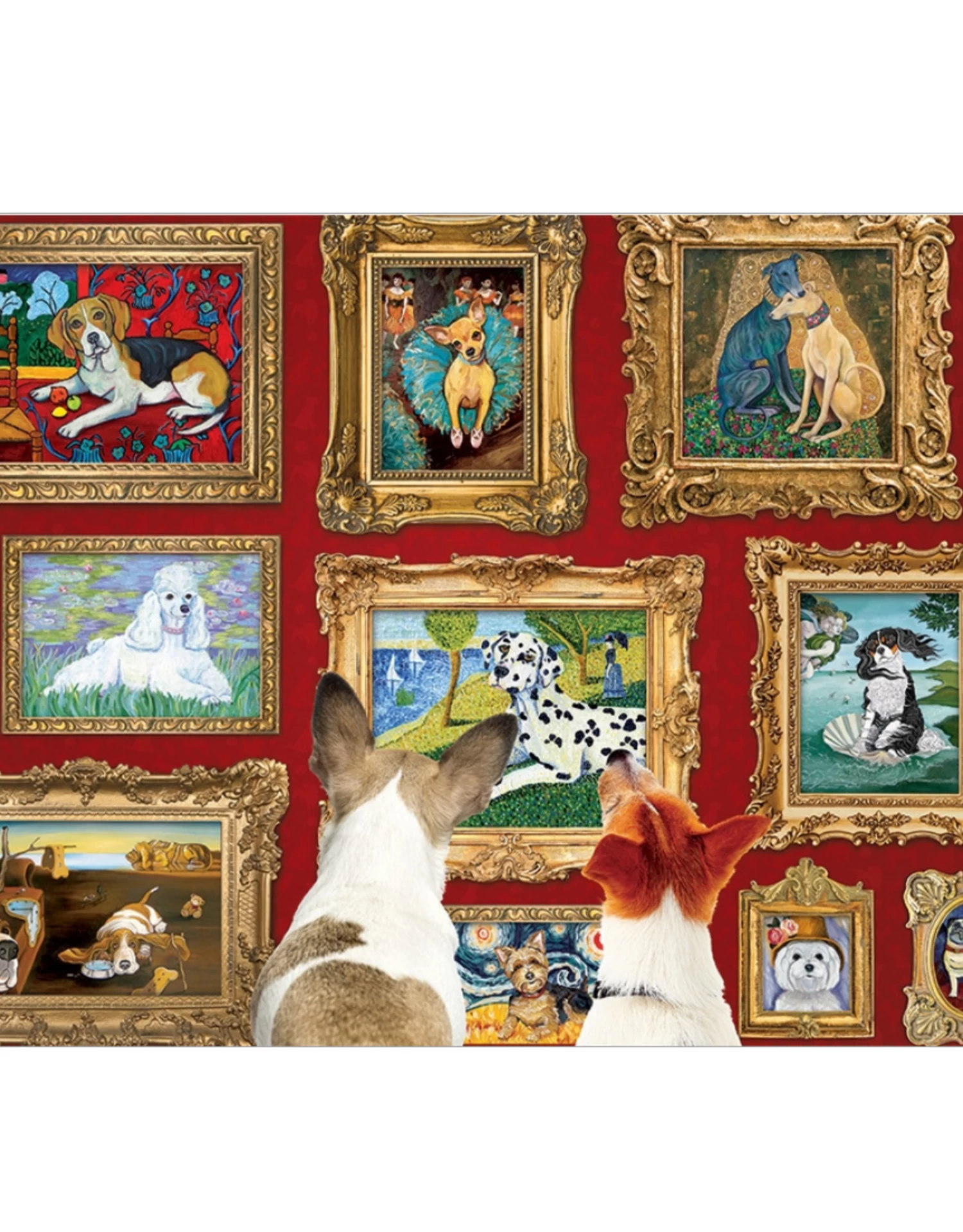The dogs at the Dog Gallery. Unfortunately, this museum doesn’t exist, but you can enjoy the fantasy of it in this 1000 piece puzzle. It’ll be an affordable way to have a version of “Starry Night” and Klimt’s “The Kiss” in your collection – if you don’t mind the interpretation with dogs 🙂 If you want to know which artist inspired the paintings, here they are from left to right, top to bottom: 1. Henri Matisse 2. Edgar Degas 3. Gustav Klimt 4. Claude Monet 5. Georges Seurat 6. Sandro Boticelli 7. Salvador Dali 8. Vincent Van Gogh 9. August Renoir 10. Marc Chagall