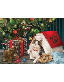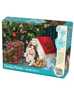 Happy Pawlidays from the cutest kittens under any Christmas tree. These lovable cats are enjoying their new cat home, blue blanket and the red ribbon from the wrapping. This Family Piece 350 puzzle includes large, medium, and small pieces that cascade from top to bottom so puzzlers of all skill levels can contribute to the fun.