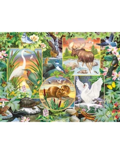 It’s a sanctuary at the River Magic gathering spot. All walks of wildlife enjoy the water as they feel the freedom of nature wash over them. You’ll find birds, moose, chipmunks, sea otters, storks, turtles, frogs, insects and more! This lovely Family Pieces 350 puzzle by Rosiland Solomon is a mini-collage type puzzles framed with various foliage and flowers.