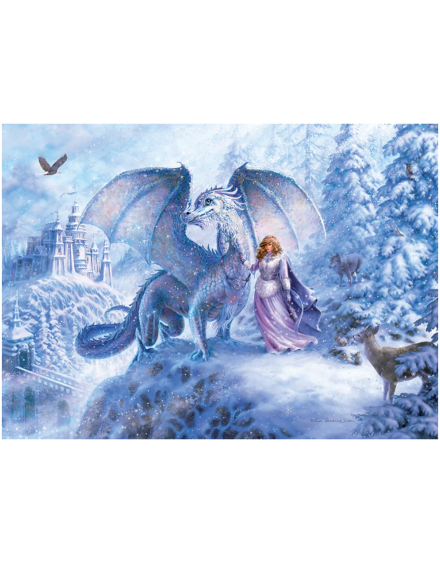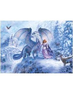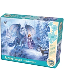 The Queen is leaving the castle with her Ice Dragon for an afternoon in the snowy forest. The kingdom wolves and deer have come to see her off. This Family Piece 350 puzzle includes large, medium, and small pieces that cascade from top to bottom so puzzlers of all skill levels can contribute to the fun.