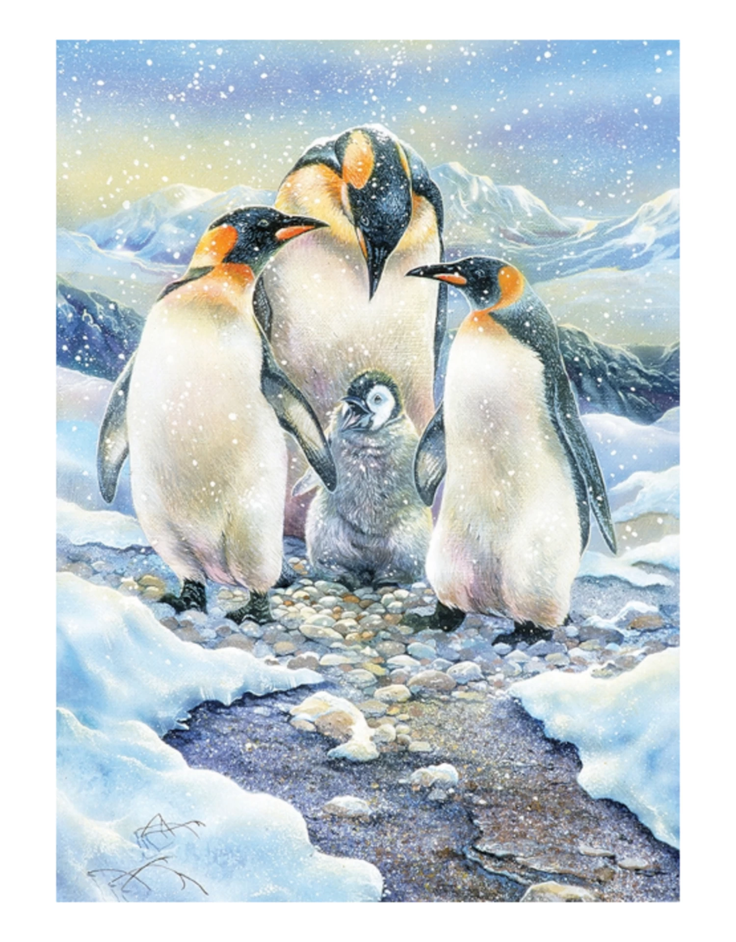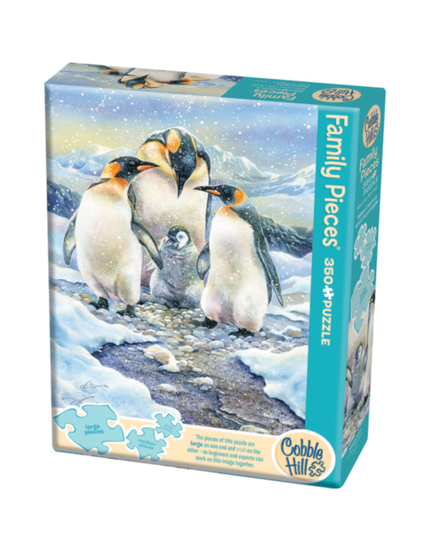 As the Penguin Family huddle together preparing to make the trek across the snowy land, baby penguin opens his mouth to catch the falling snow. This Family Piece 350 puzzle includes large, medium, and small pieces that cascade from top to bottom so puzzlers of all skill levels can contribute to the fun.