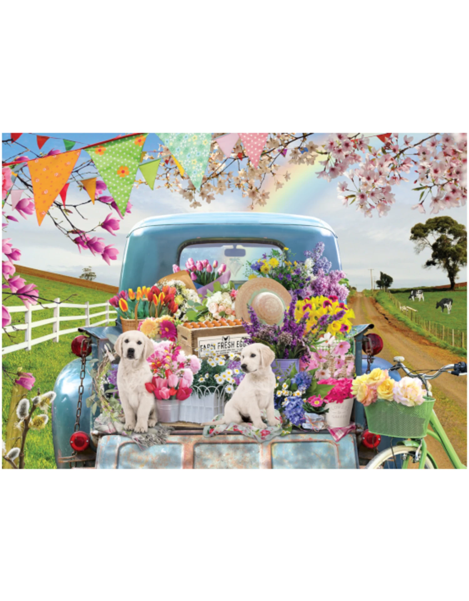 The Country Truck in Spring is full of colour with beautiful flowers, ribbons, and rainbows! A cheerful 500 piece puzzle equipped with cuddly puppies.
