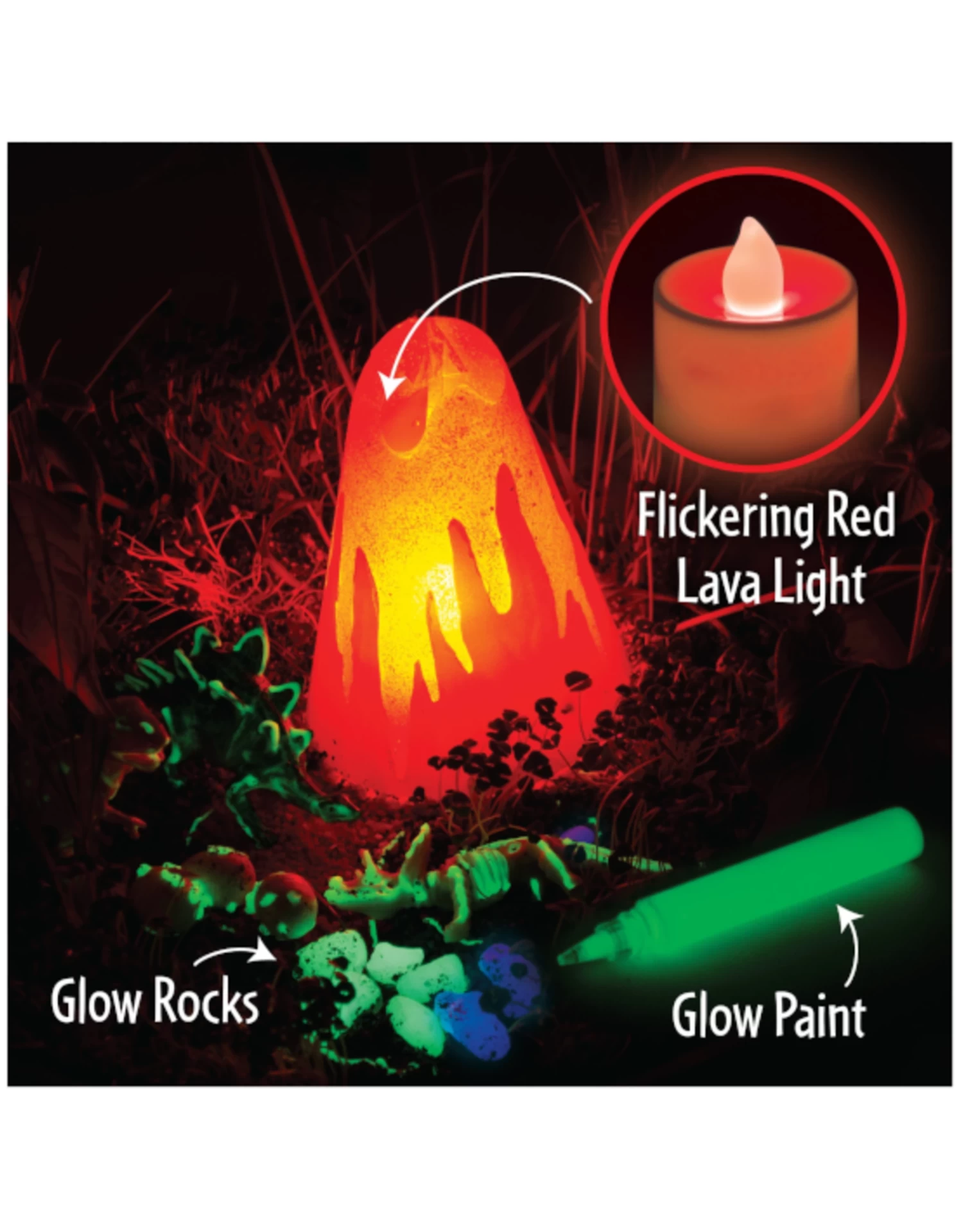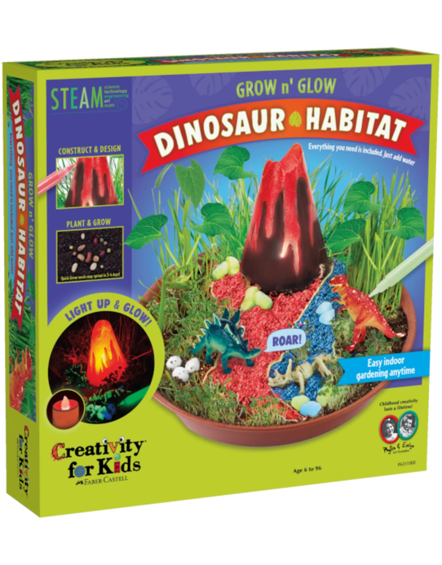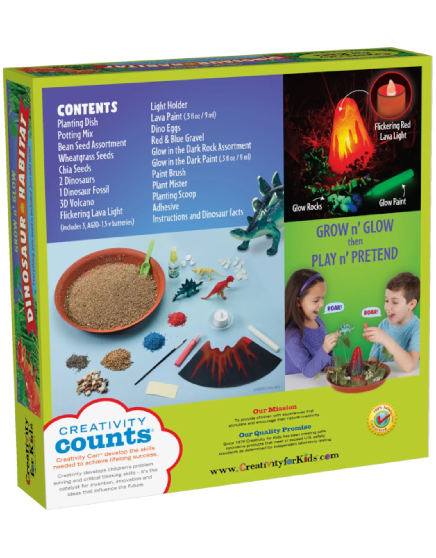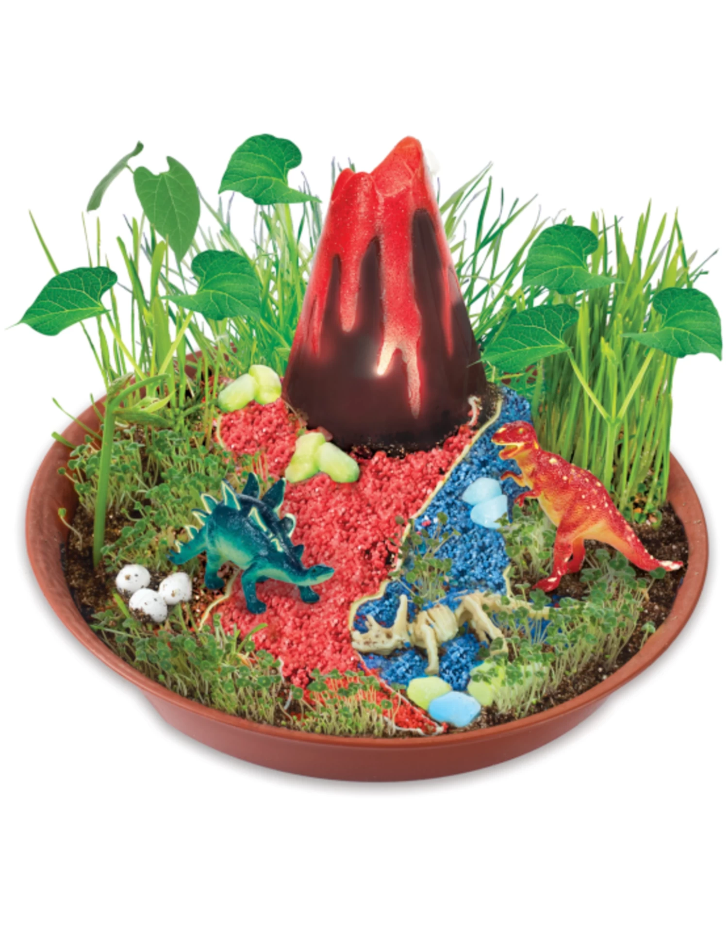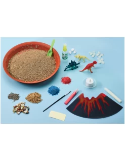 Contents Include: Planting dish, potting mix, bean seed assortment, wheatgrass seeds, chia seeds, 2 dinosaurs, 1 dinosaur fossil, 3D volcano, flickering lava light, light holder, lava paint (.3 fl oz/9 ml), dino eggs, red & blue gravel, glow-in-the-dark rock assortment, glow-in-the-dark paint (.3 fl oz/9 ml), paint brush, plant mister, planting scoop, adhesive, instructions and dinosaur facts
