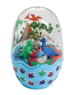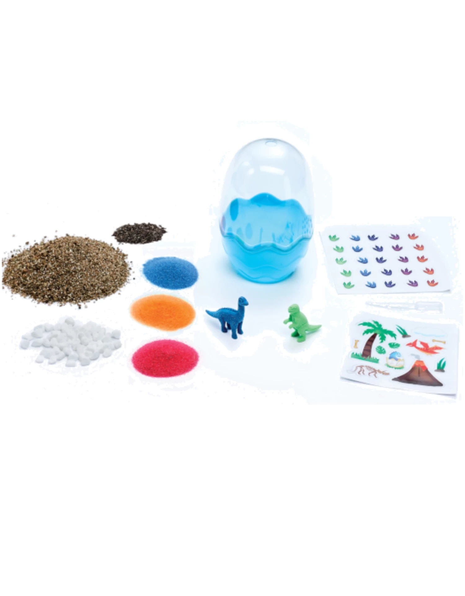 Contents Include: plastic egg terrarium, potting mix, water dropper, sticker sheet, colored sand (red, blue, orange), white gravel, 2 dinosaurs (green, blue), puffy stickers
