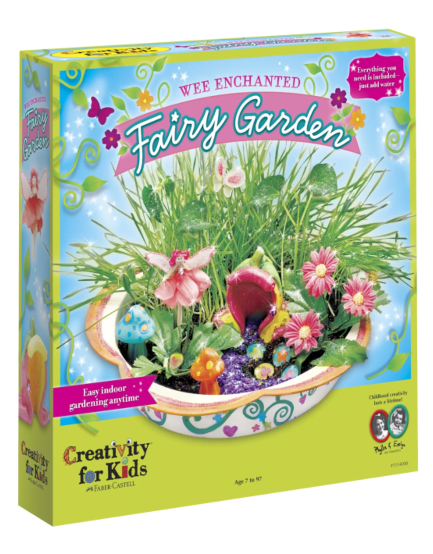With a little creative magic, you can grow your own enchanted fairy world. Garden set includes an 11″ diameter flower shaped gardening dish, enchanted flower house, tiny gemstone treasures, flowers, butterflies, paint, soil and seeds that grow like magic. Finish off your garden with a friendly fairy, a sparkling garden path and teeny tiny toadstools. Creativity for Kids launched the Garden Crafts Category 25 years ago with the original Wee Enchanted Garden. Over the years this delightful experience transformed into the Wee Enchanted Fairy Garden.
