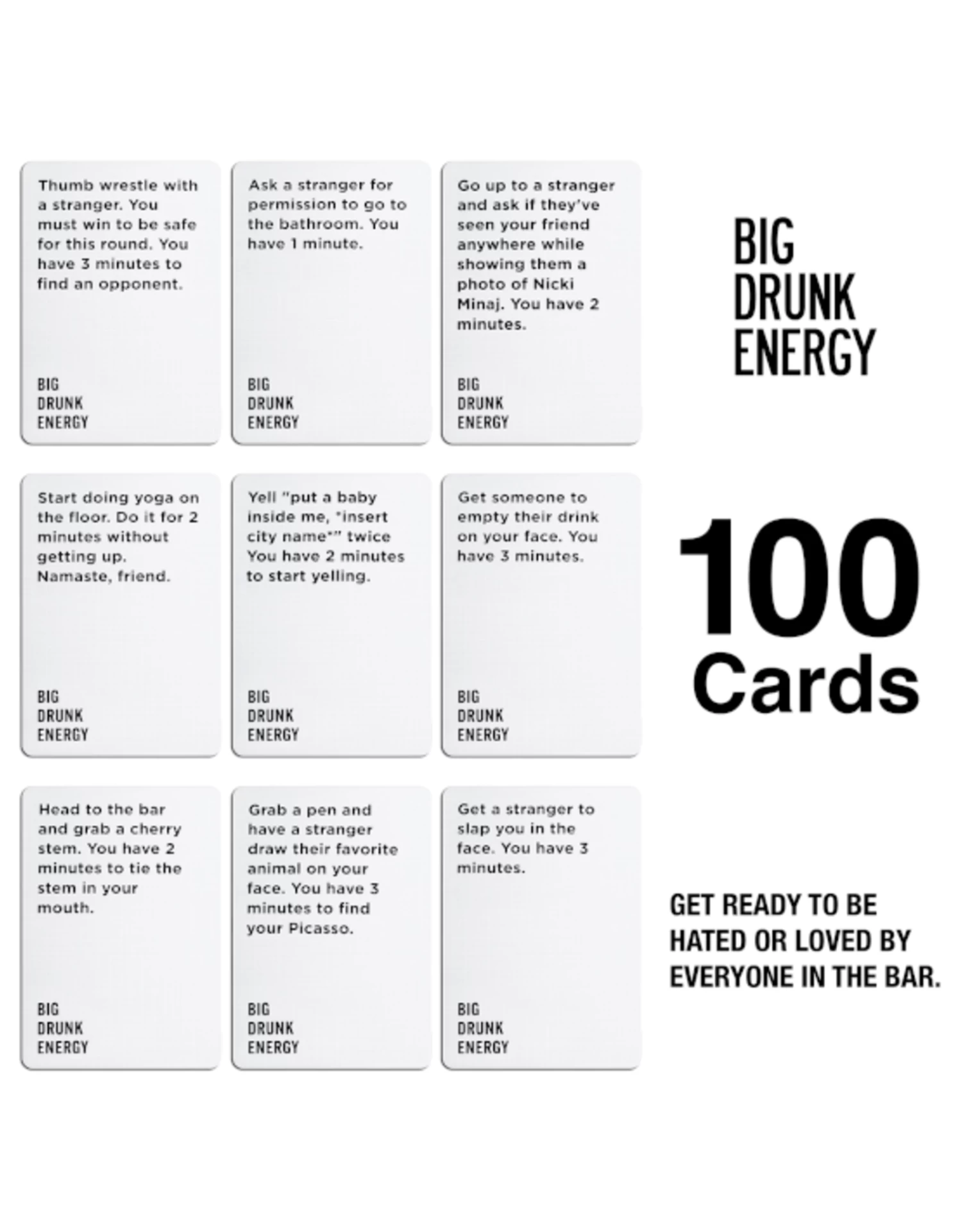 You might not have Big Drunk Energy when you start the game, but if you play tour cards right, you;ll definitely have it when you’re done. 100 cards. 100 opportunities to get so embarrased that you’ll never want to go out in public again. Full rules are inside. Free drinks are at stake. Just don’t do anything illegal, you idiots.