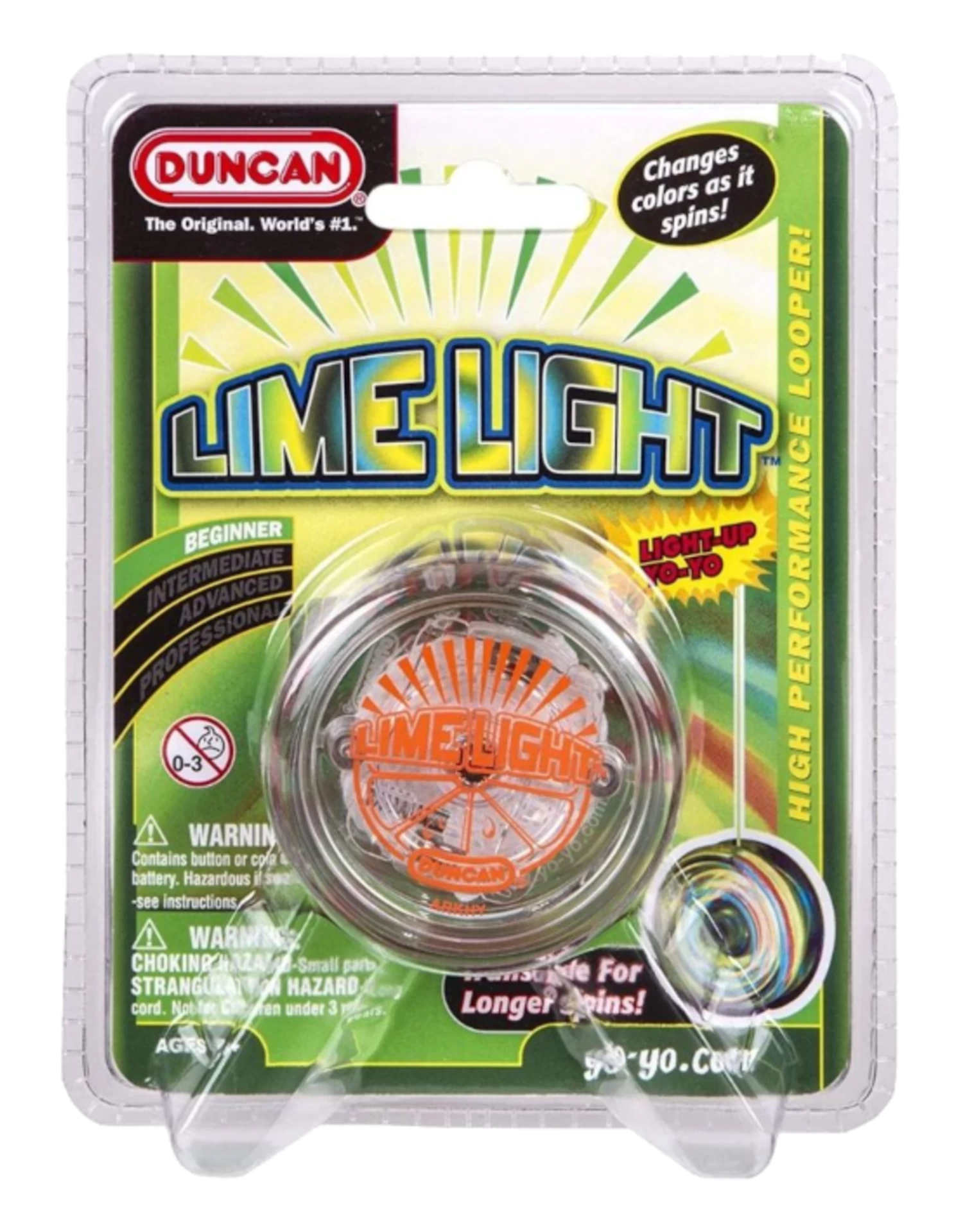 The Limelight features a rim-weighted body made of durable polycarbonate plastic encasing special LED light technology that blinks and changes colors and patterns while it spins! It has a replaceable trans axle for looping tricks giving it the feeling of a classic yo-yo in a modern plastic design.