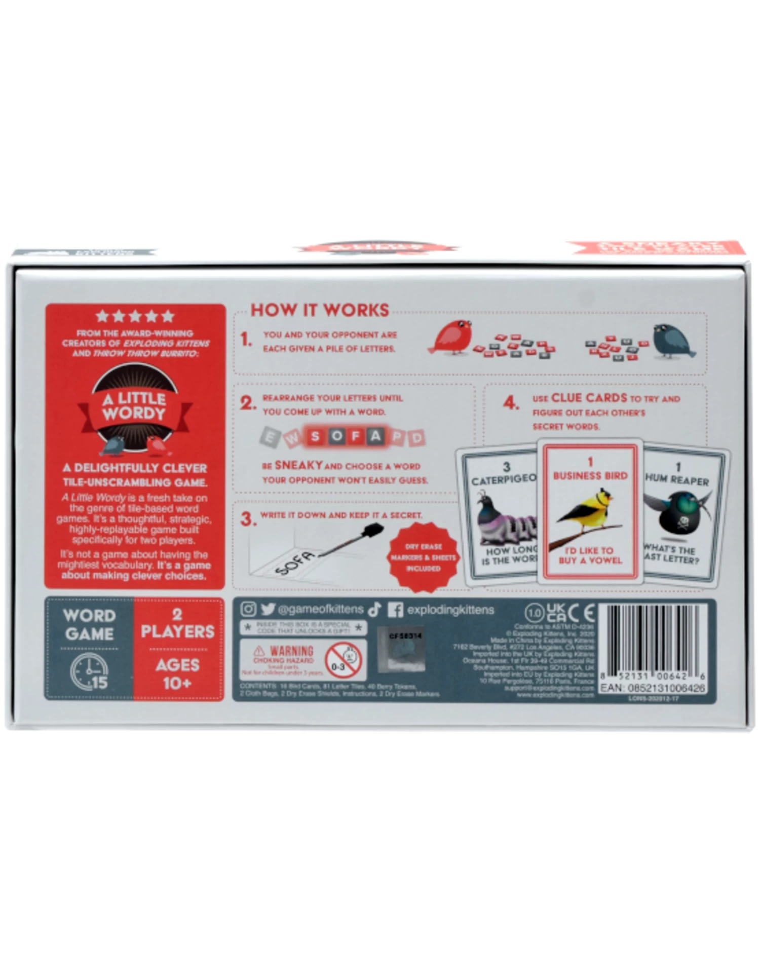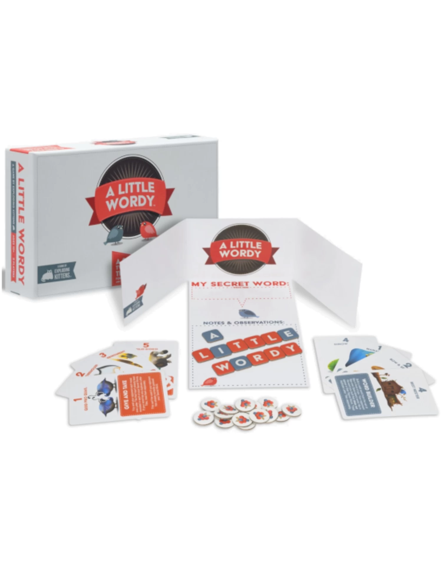 From the award-winning, best-selling creators of Exploding Kittens and Throw Throw Burrito, A Little Wordy is a fresh and clever take on the genre of tile-based word games. Instead of just being another version of “who has the biggest vocabulary?” A Little Wordy requires players to assemble a word from a set of tiles and keep that Secret Word to themselves. Each player then takes turns trying to decipher each other’s Secret Word by paying for clues and hints.
