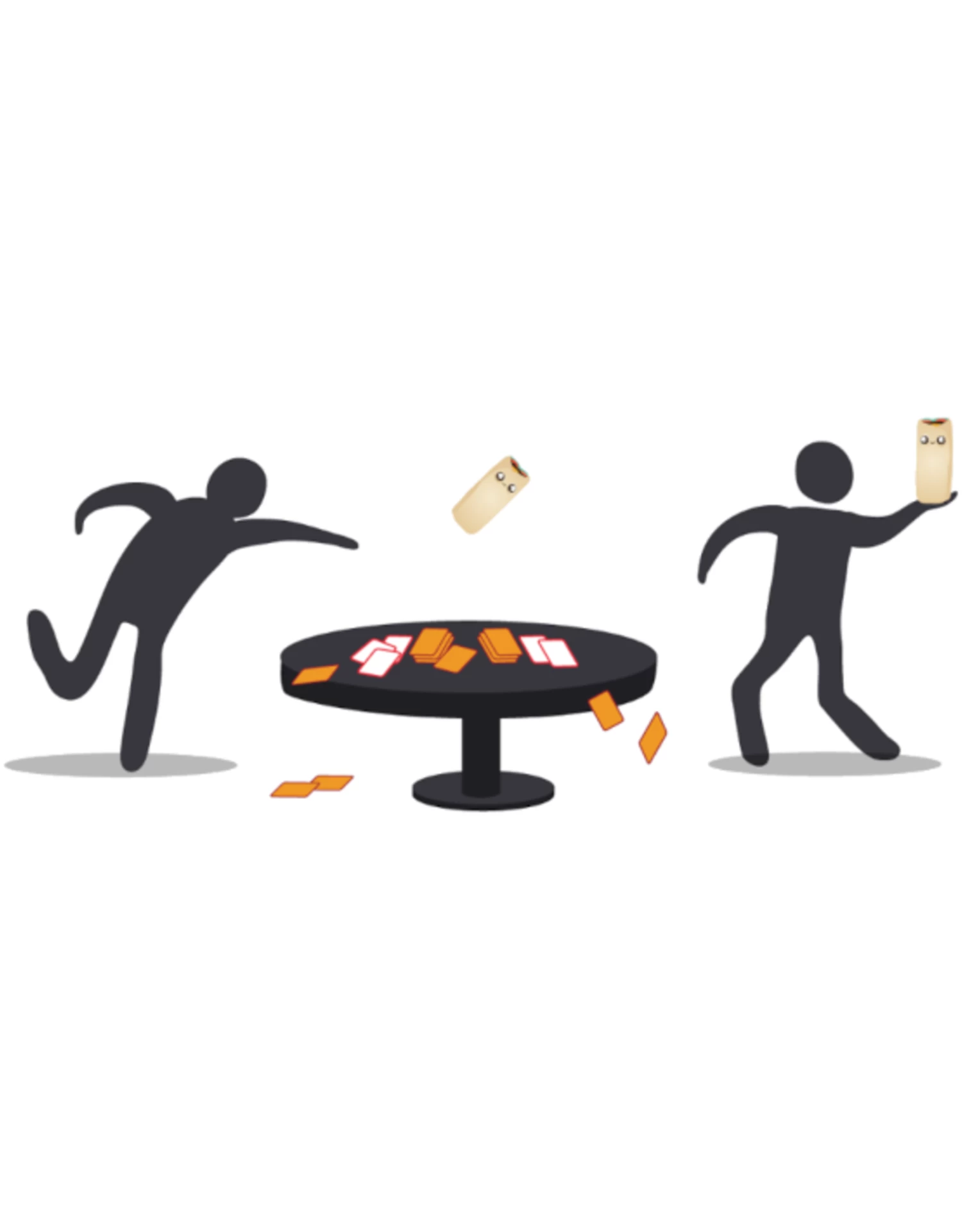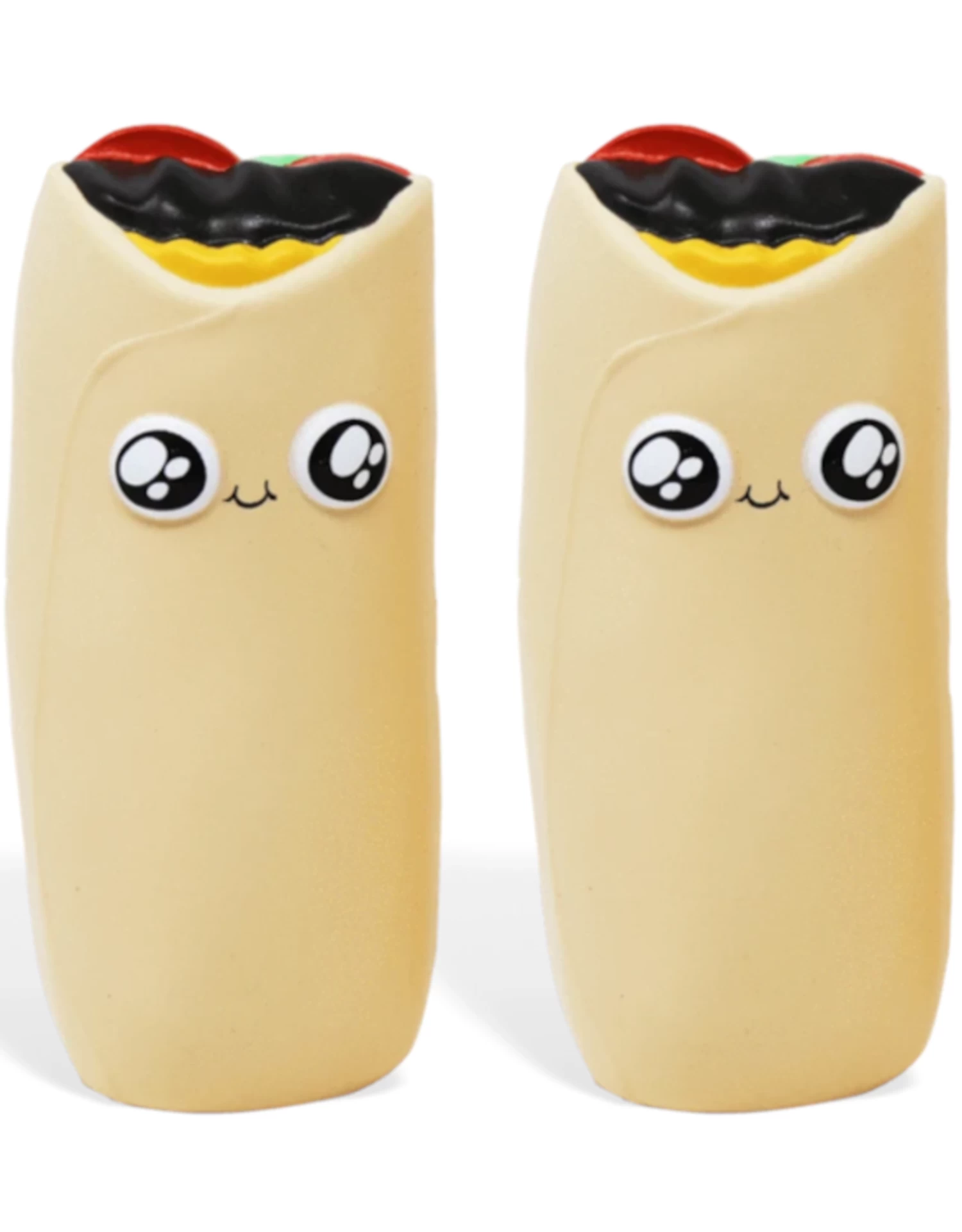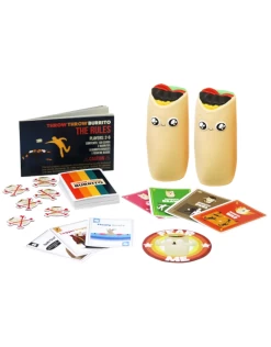 How it works: Place a pair of burritos on a table and draw cards. Keep your cards a secret. Rack up points by finding sets of three in the deck. Find matches before anyone else does. If someone plays Burrito Cards, a Battle ensues. Steal points from your opponents by hitting them with squishy toy burritos. Declare war on your friends. Some battles only involve a handful of players. Others force the entire table to engage in a Burrito War. Duel to determine the winner. During a Burrito Duel, two players must stand back to back, walk three paces, and FIRE.