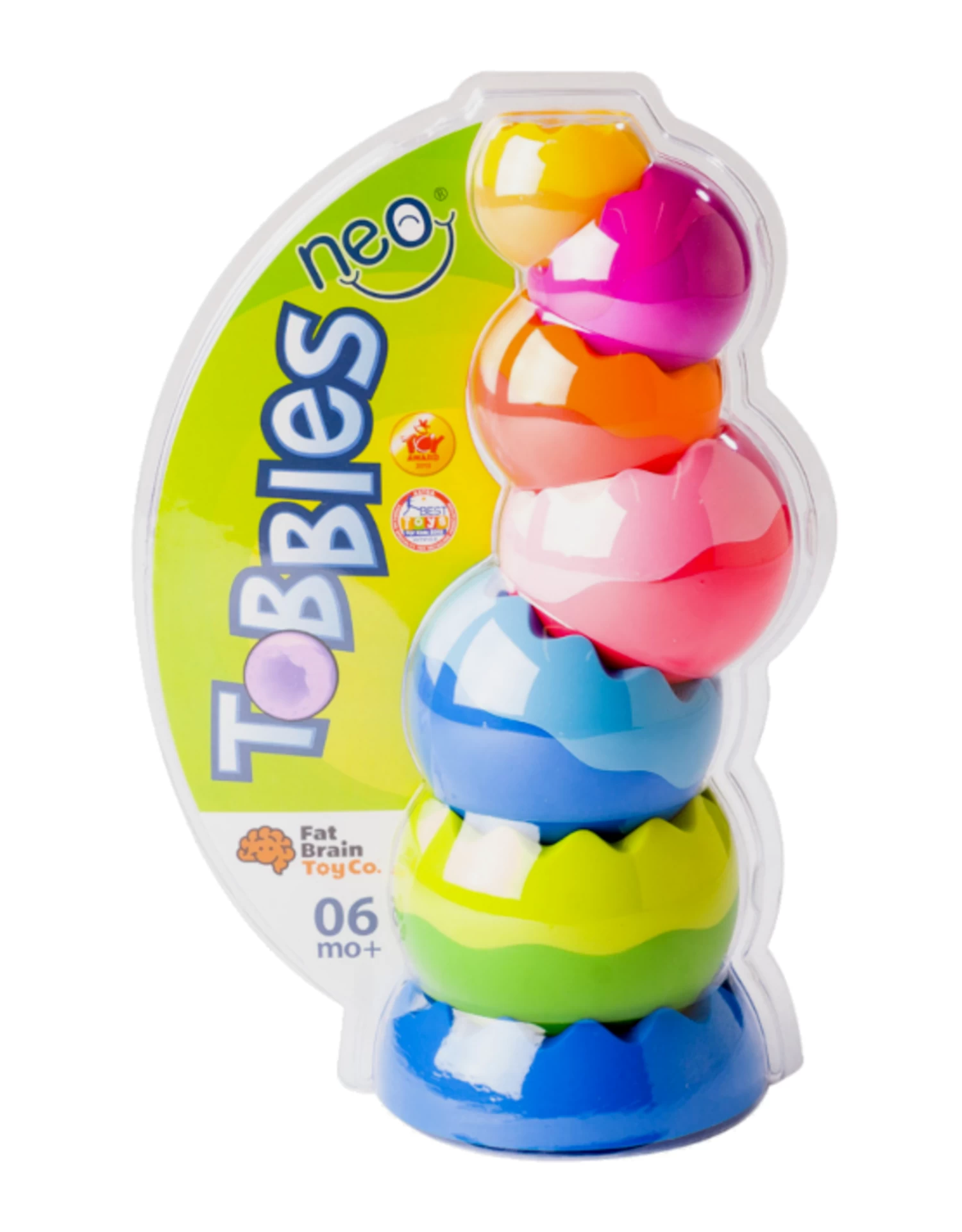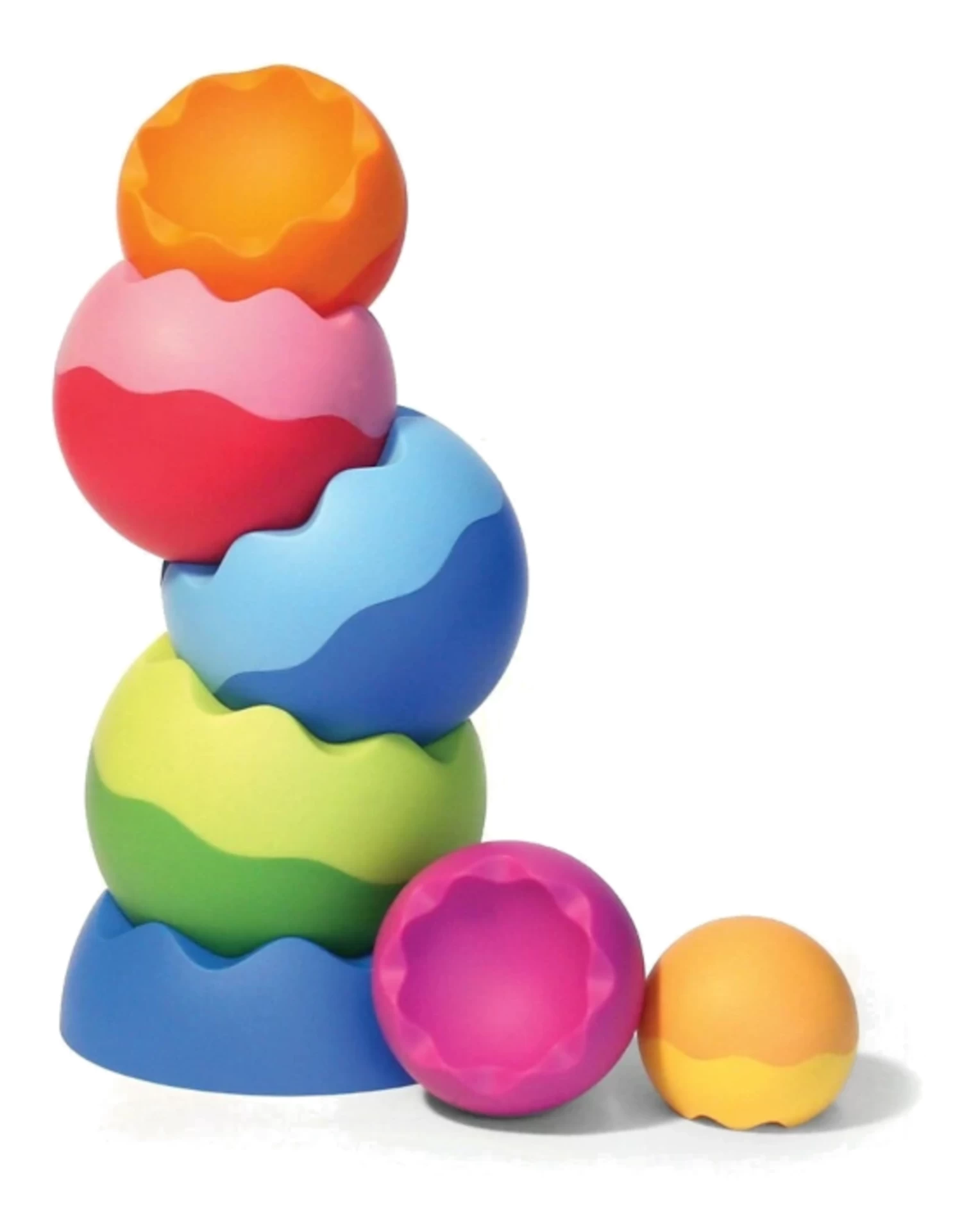 Tobbles Neo – bright and cheerful colors, the physics of motion – and the addition of more tactile clout! The unique grippable texture of Tobbles Neo awakens touch. See those gentle, playful curves? They truly enliven tactile experiences. Young minds revel in stacking, toppling, and the discovery of endless ingenuity with Tobbles Neo. Six uniquely weighted pieces balance, neatly nest, and incessantly spin beyond your expectations. Gratifying to hold in your hands, weighted to invite investigation, and likely to be swiped from your possession. Little hands can’t get enough of the stacking, toppling, spinning, balancing, wobbling, tilting, and wiggling! Another welcome invitation to timeless play.