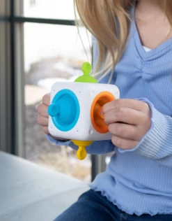 Built into each side of this sturdy, rounded cube is a soft dimpl bubble with a tab to grab and pull. Fingers can’t help but push them, pull them, and pop them again and again. All the while, fine motor skills are honed and busy minds are soothed!