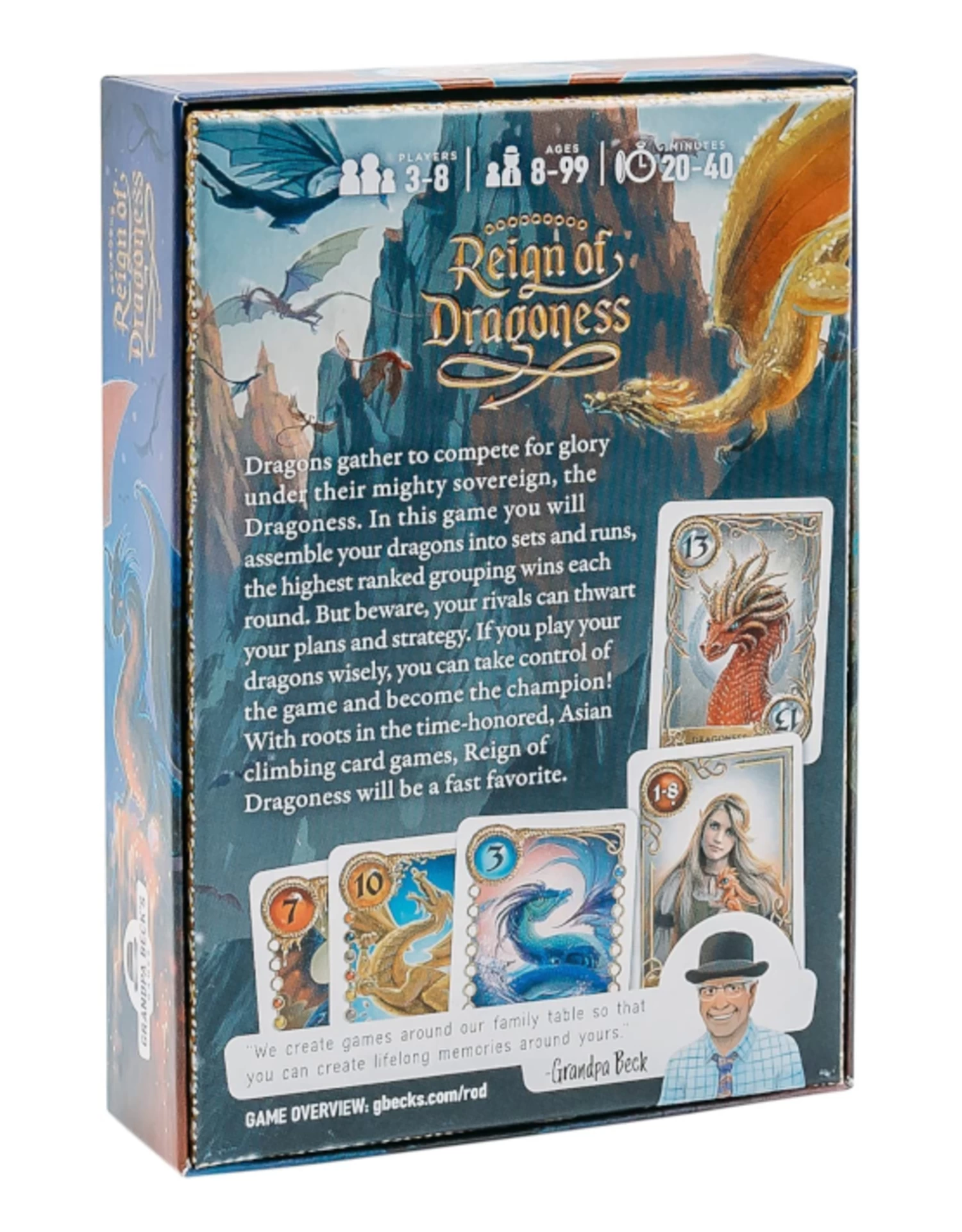 Reign of Dragoness is a twist on the time-honored ladder climbing card games. Using your dragons wisely, you will play your cards in sets and runs, trying to beat the cards played before you. The battle to play your cards before your competitors will be full of fun and strategy. Quick rounds will make this an addicting family favorite!