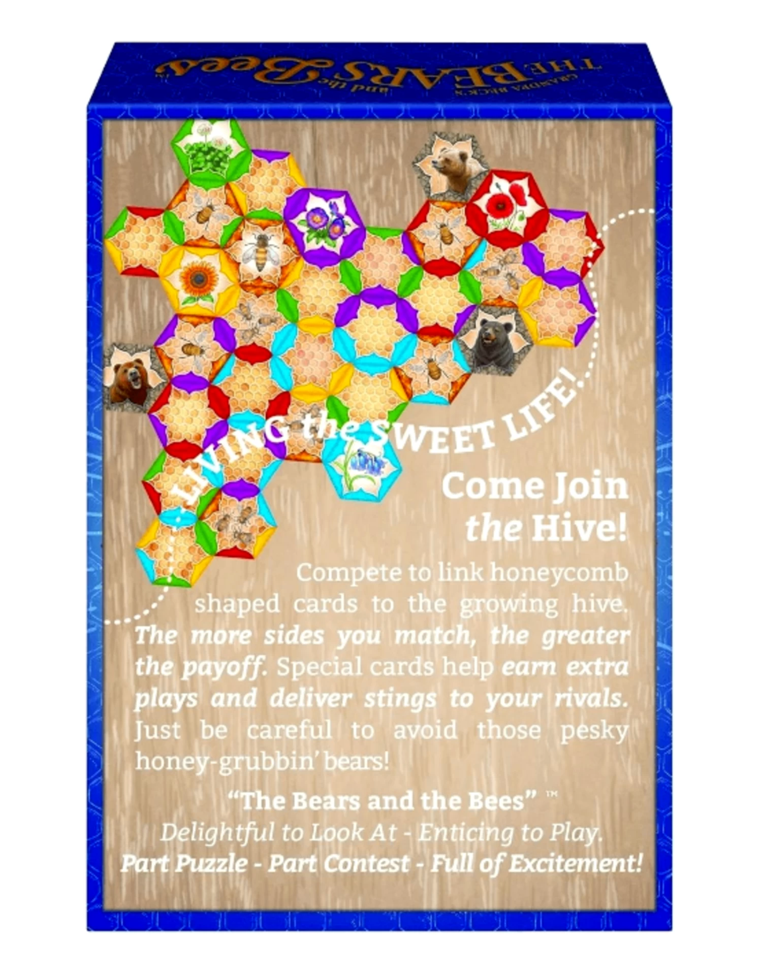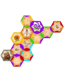 Your goal is to be the first player to eliminate all the honeycomb-shaped cards from your hand. Play cards that match on 2 or more sides connecting to the ever-growing beehive. Match more than 2 sides to earn bonus plays which help you play extra cards.