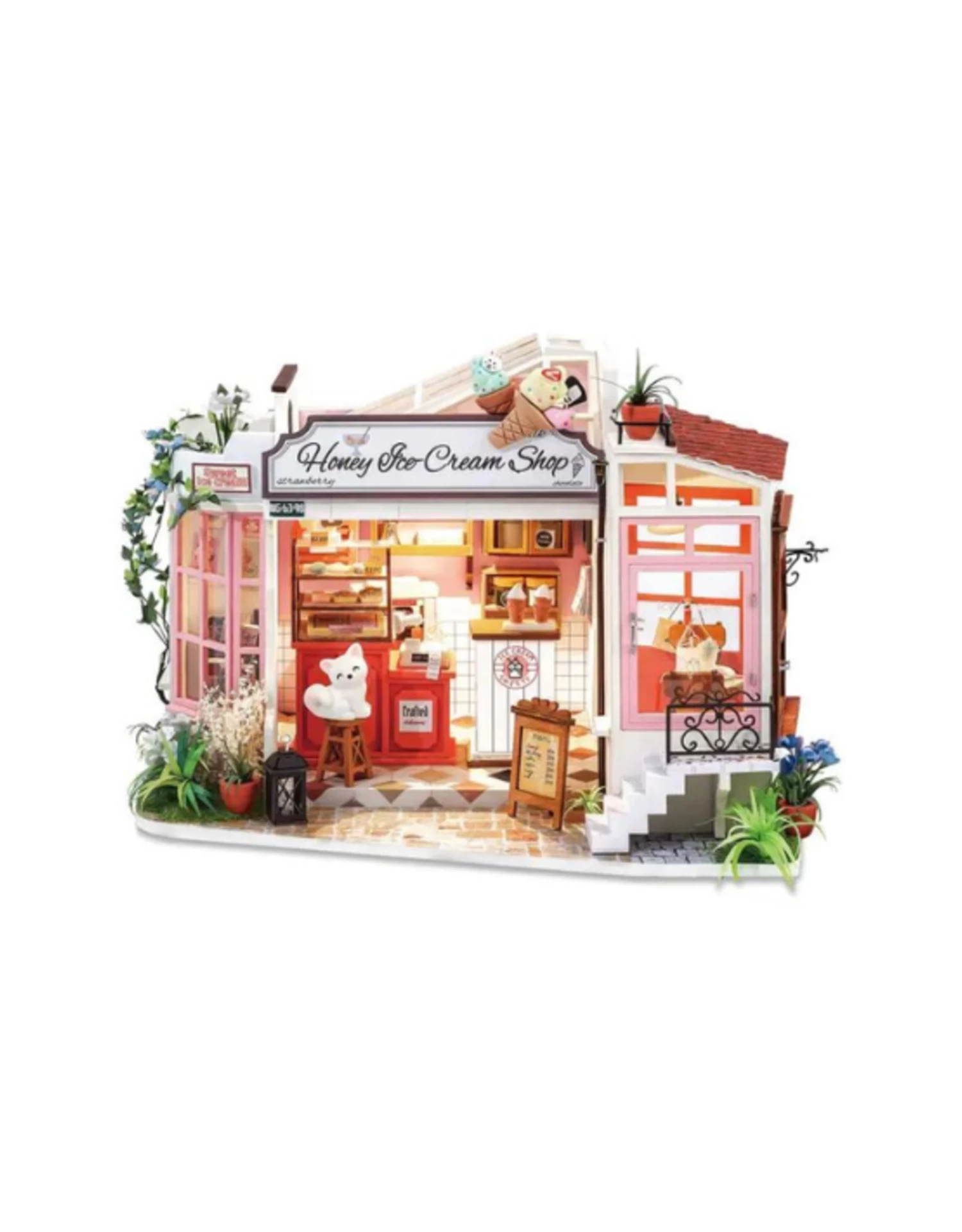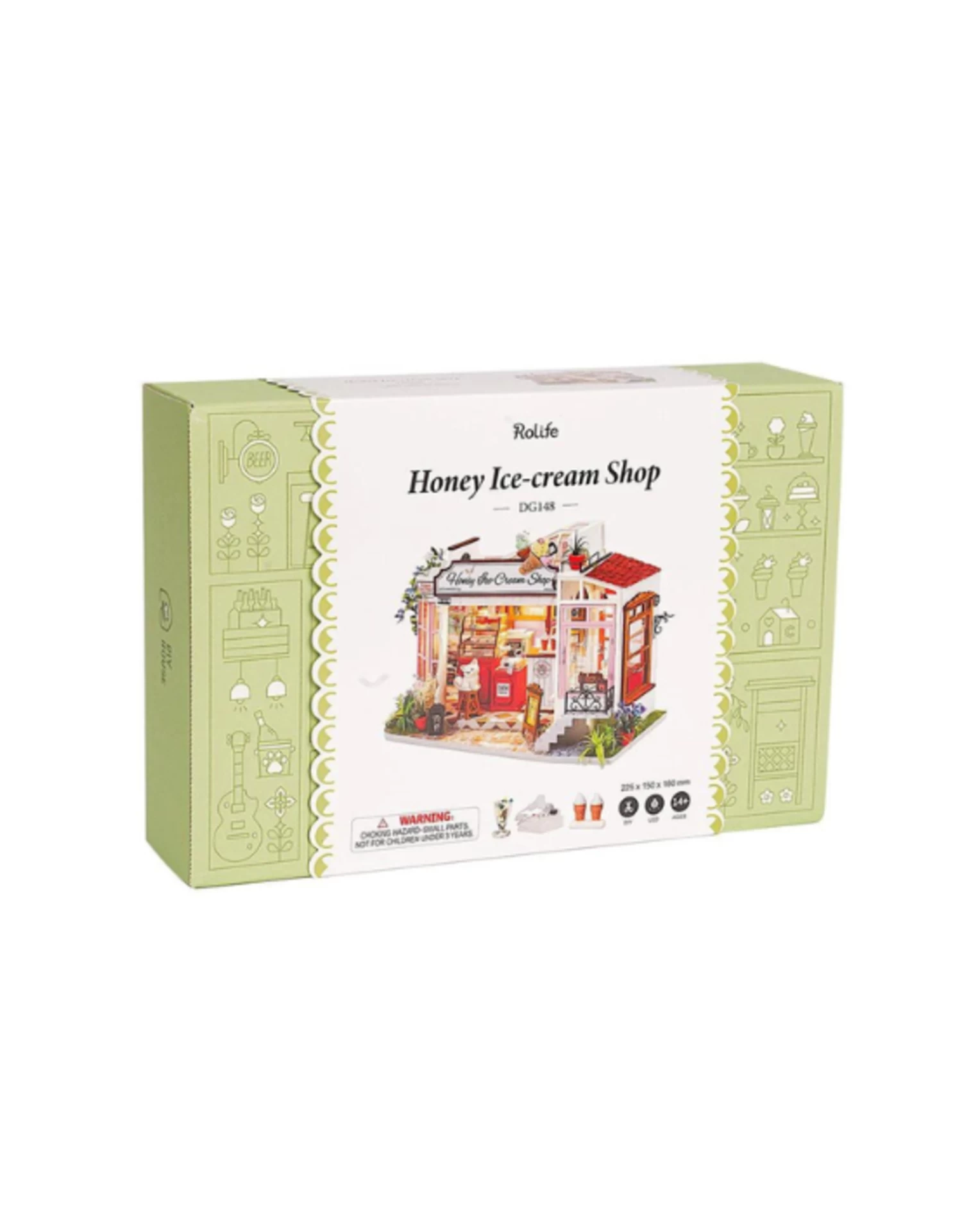 • Whether this is your first 3D dollhouse puzzle or you are looking to expand your already existing craft collection, you’ve come to the right place. This tiny Honey Ice-Cream Shop will keep you busy as you design and create the perfect little space. Kids and adults alike will enjoy our 3D wood puzzle.