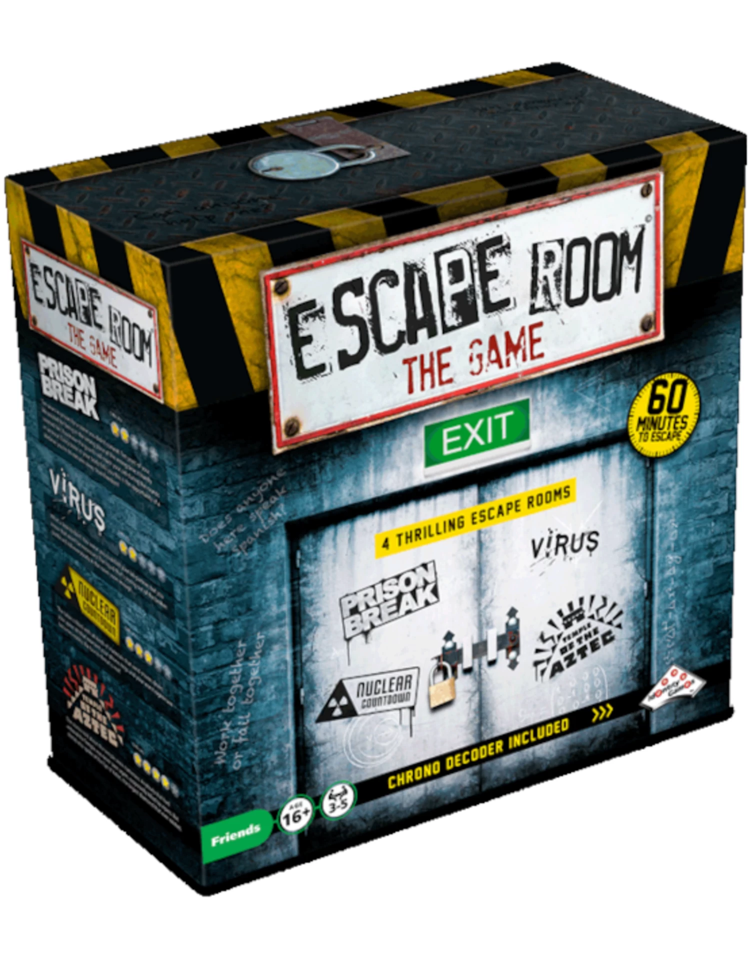 The 4 escape rooms vary in difficulty, designed to give any group the experience they expect and deserve. If you’re craving more puzzles, Escape Room expansions will be available, but you’ll need the base game first as the Chrono Decoder is essential to the experience. Included in the base game in order of difficulty is: Prison Break, Virus, Nuclear Countdown, and Temple of the Aztec