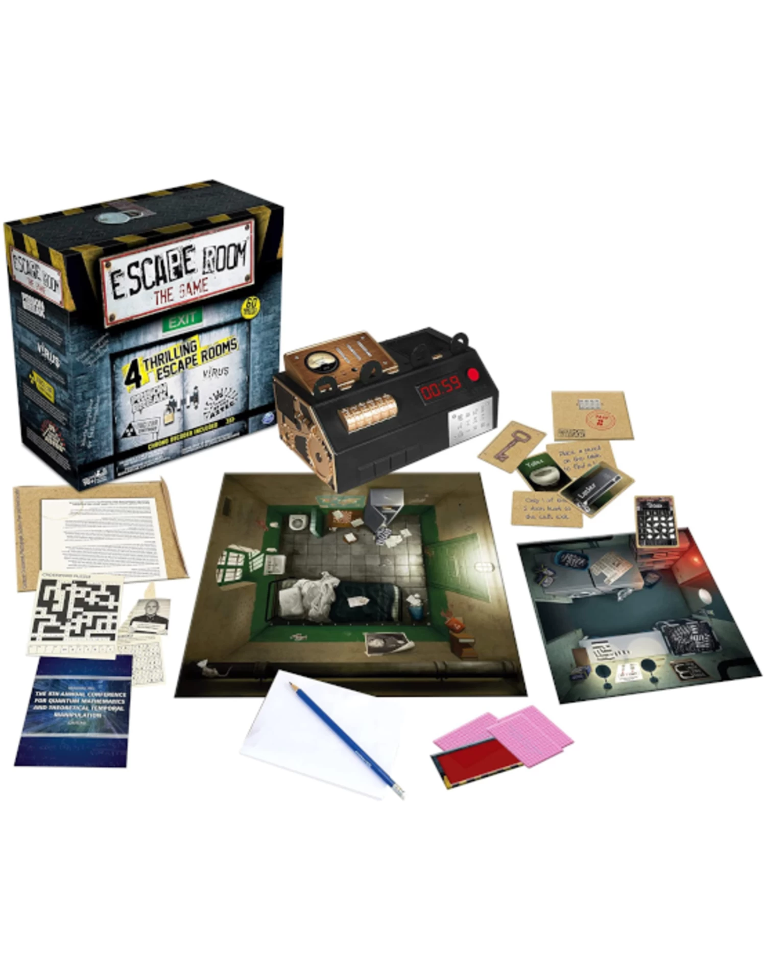 Take the viral social experience of Escape Rooms to the comfort of your own home and for a fraction of the cost that you would pay! Included in this game are 4 unique 60 minute escape room puzzles that will test your cranial skills. Use images, gears, words, keys, shapes, maps and more to solve the three stages within each escape room. An analog timer on the Chrono Decoder centerpiece incessantly counts down, emitting ominous noises to create an environment shut out from the outside world. If the puzzles stump you for too long, slide a hint card into the Hint Decoder to keep your team moving. Slide 4 keys into the Chrono Decoder when you think you have the answer… but beware, if you’re wrong, a precious minute will be taken from you.