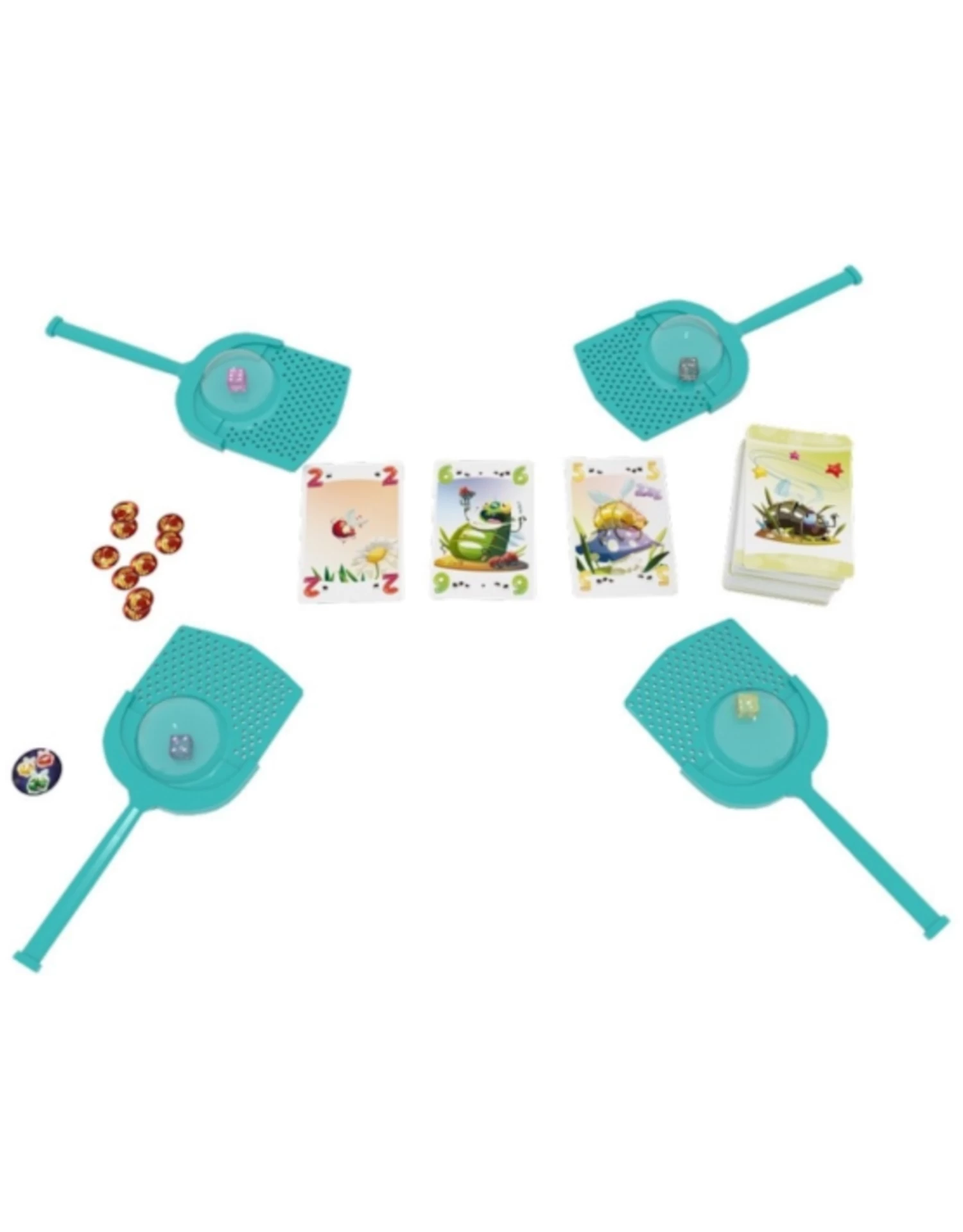At the start of each turn, a number of cards are laid out, then someone counts “1, 2, 3!” at which point everyone smashes their die-filled flyswatter onto their chosen card. If you’re the only one to swat a card, you claim it; if multiple people swat a card, then whoever “rolled” the highest number with the die in their flyswatter wins the card. The only exception: If you rolled a number that matches the number on the card, then the bug is killed and removed from play!