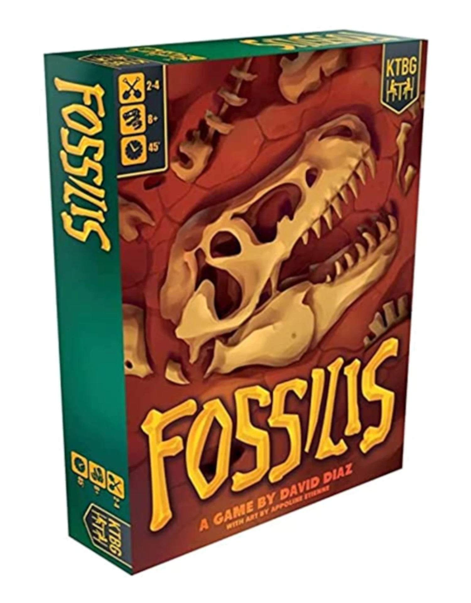 Fossilis features a unique 3D dig site board, with recessed pockets filled with dinosaur bones, and thick, chunky terrain tiles that cover the dig site. Players have to use strategy, timing, and a little bit of luck if they want to make the best discoveries, get their name in all the paleontology journals, and of course, win the game.