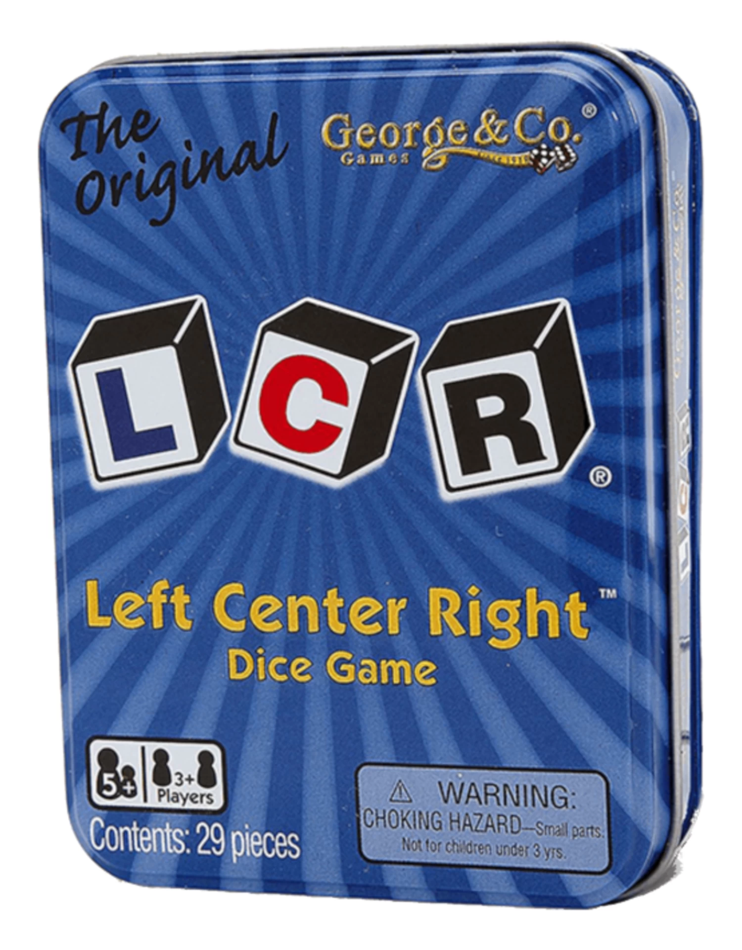 This game consists of three dice and a set of poker chips. Each player starts with three chips and on their turn a player rolls the three dice. For each “L” rolled, they give a chip to the player on their left. For each “R” rolled, they give a chip to the player on their right. For each “C” rolled they put a chip in the middle of the table. For each dot rolled, nothing occurs. The dice are then passed to the next (clockwise) player. If at any point, only one player has all of the chips, that player wins the game.