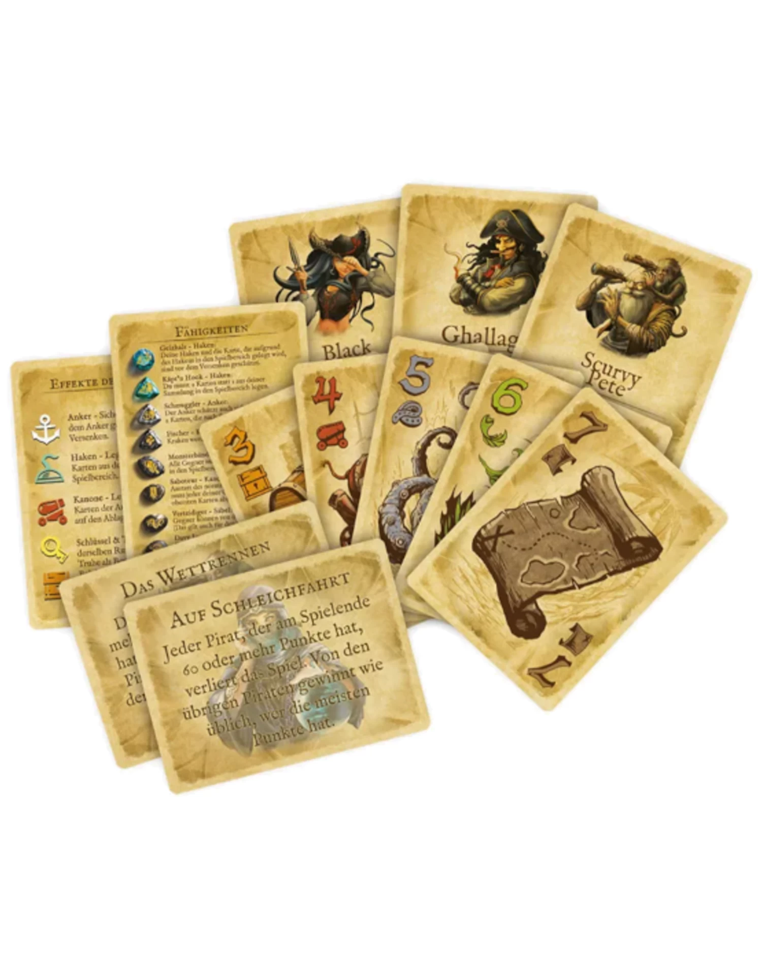 The core of your turn in Dead Man’s Draw is all in the flip of the cards; pulling the top card from the deck and using its special ability. Keep drawing cards and risk losing it all, or play it safe and bank your treasure. When you draw two cards of the same suit, your booty goes down to Davy’s Locker! Remember – no pirate gets rich by playing it safe!