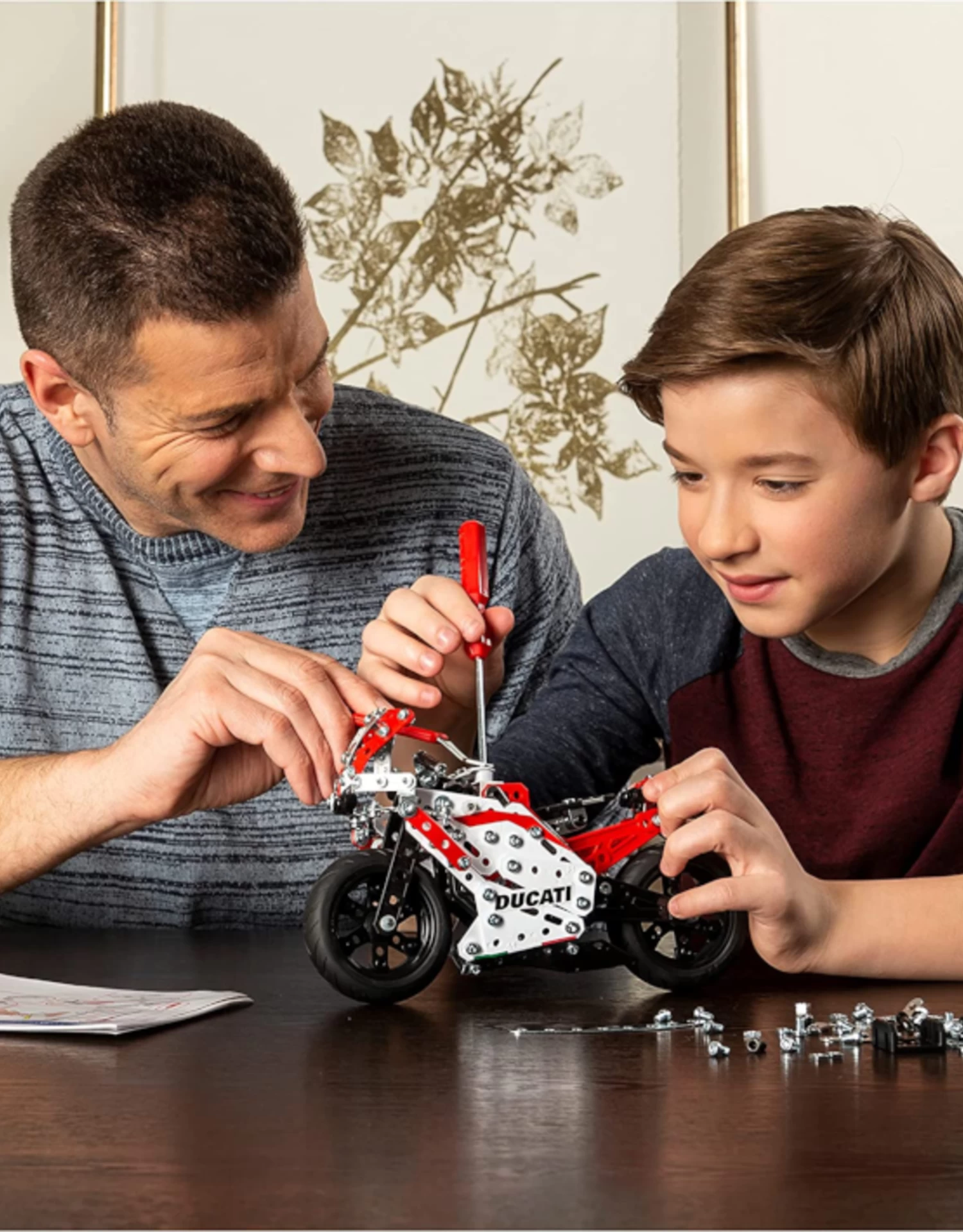 It’s slick. It’s iconic. And it’s ready for building! Introducing Meccano’s Ducati model motorcycle kit! In this set, young builders get hands on as they use real tools (included) to create an authentic Ducati Desmosedici GP– complete with coil-spring suspension and multi-piece wheels! The ideal challenge for the experienced builder, this S.T.E.A.M. kit encourages curious young minds to explore concepts from science, technology, engineering, arts and math, while piecing together metal parts. As they tighten the last bolt and add the authentic decals, (included) young builders experience an incredible sense of satisfaction and accomplishment! Once finished, builders can proudly put their creation on display or take their new wheels for a spin! For years, Meccano has created imaginative construction sets that inspire the next generation of innovators. Give the budding engineer, inventor or technology whiz in your life an exciting new challenge: build the Ducati Desmosedici GP!