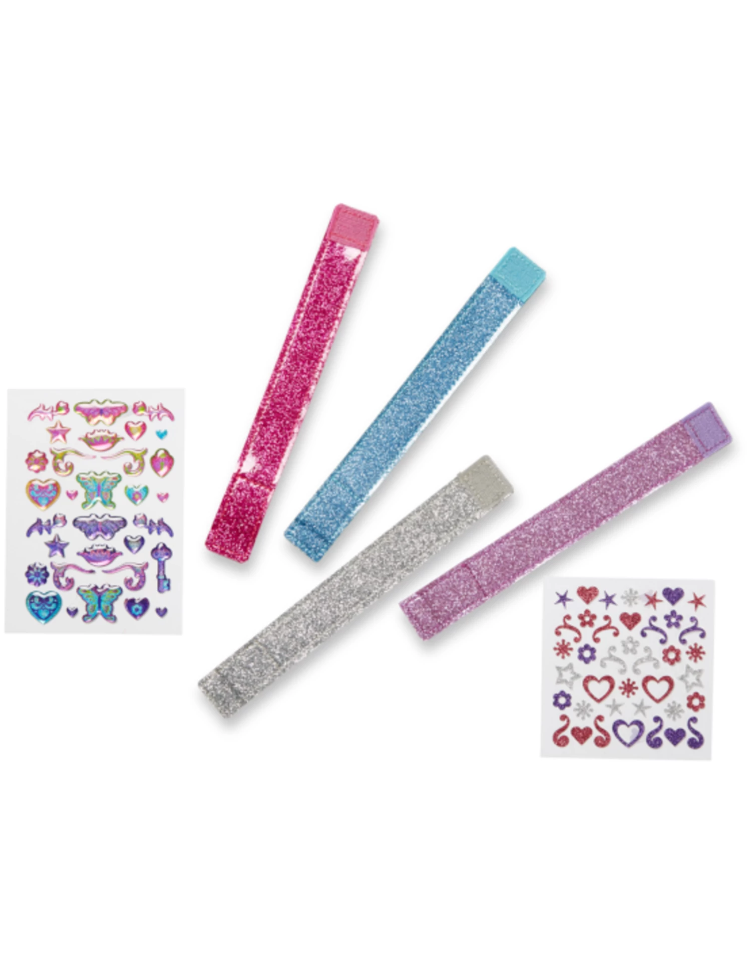 This exciting fashion activity set and bracelet craft kit lets kids make their own accessories to wear and share! The set includes four two-sided kids’ bracelets, with a different shimmering color on each side. Just add the included sparkle-gem and glitter stickers to fill each one with flowers, hearts, butterflies, stars, loops, and swirls. Make your own bracelets, then close the reusable tab closure to wear your favorite–or layer a bunch for a sparkling fashion statement!