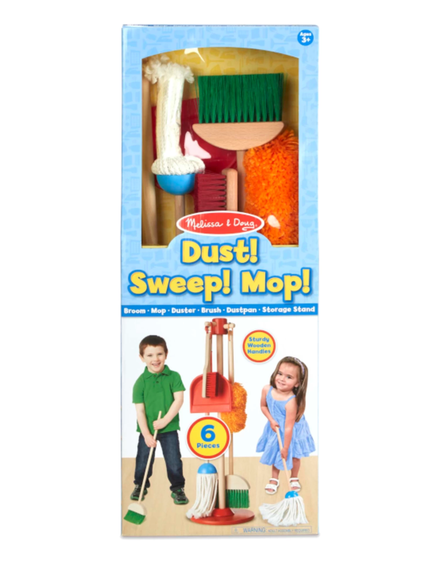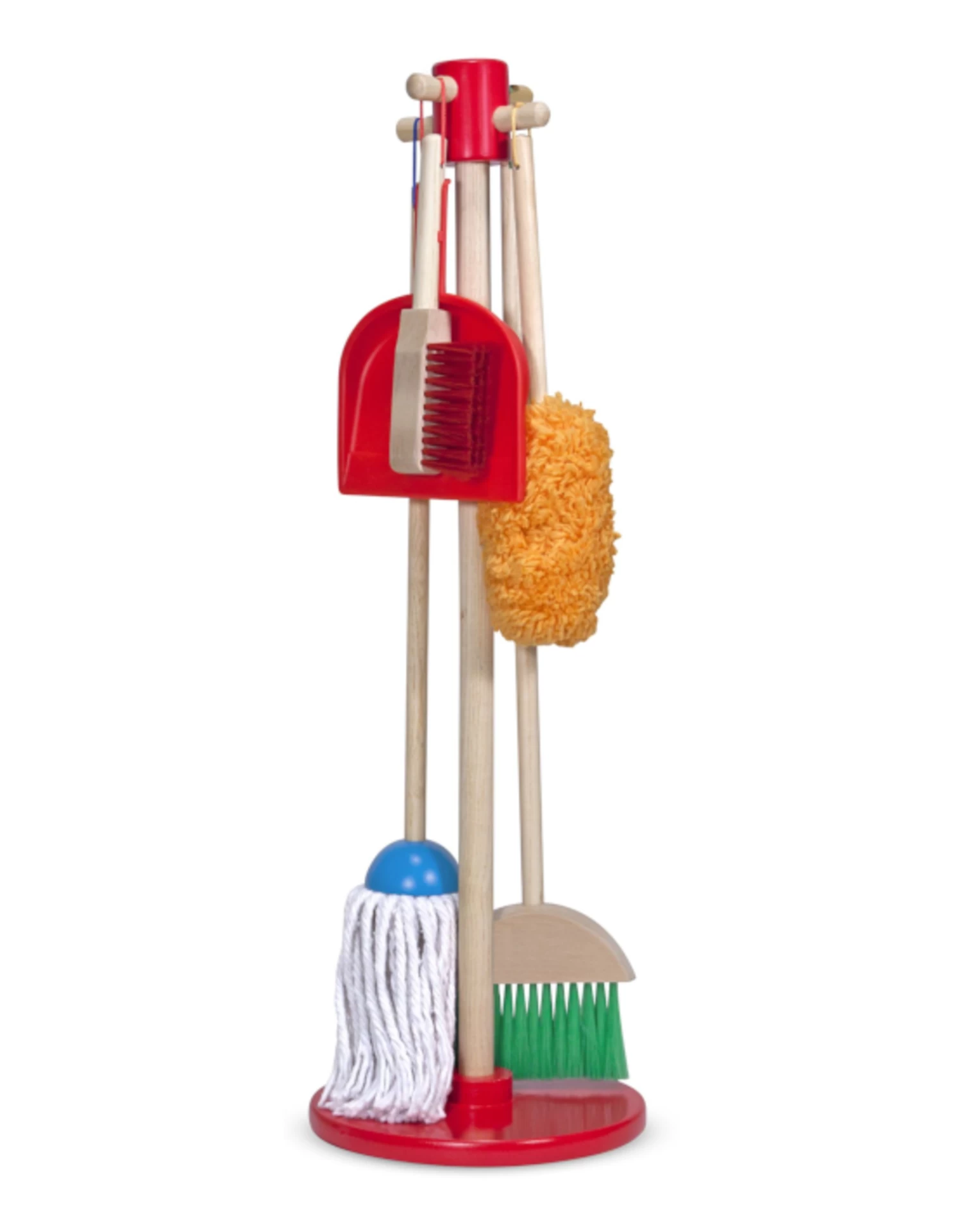 This six-piece play set gives kids all the housekeeping tools they need to keep it clean! Sized just for kids and built to last, the broom, mop, duster, dustpan, and hand brush are comfortable to use and easy to store–just hang them from the sturdy cords onto the included stand for neat, compact storage. (The dustpan can also snap onto any of the handles.) Natural-wood handles add durability and a classic look; bright pops of color keeps lots of fun in the mix!