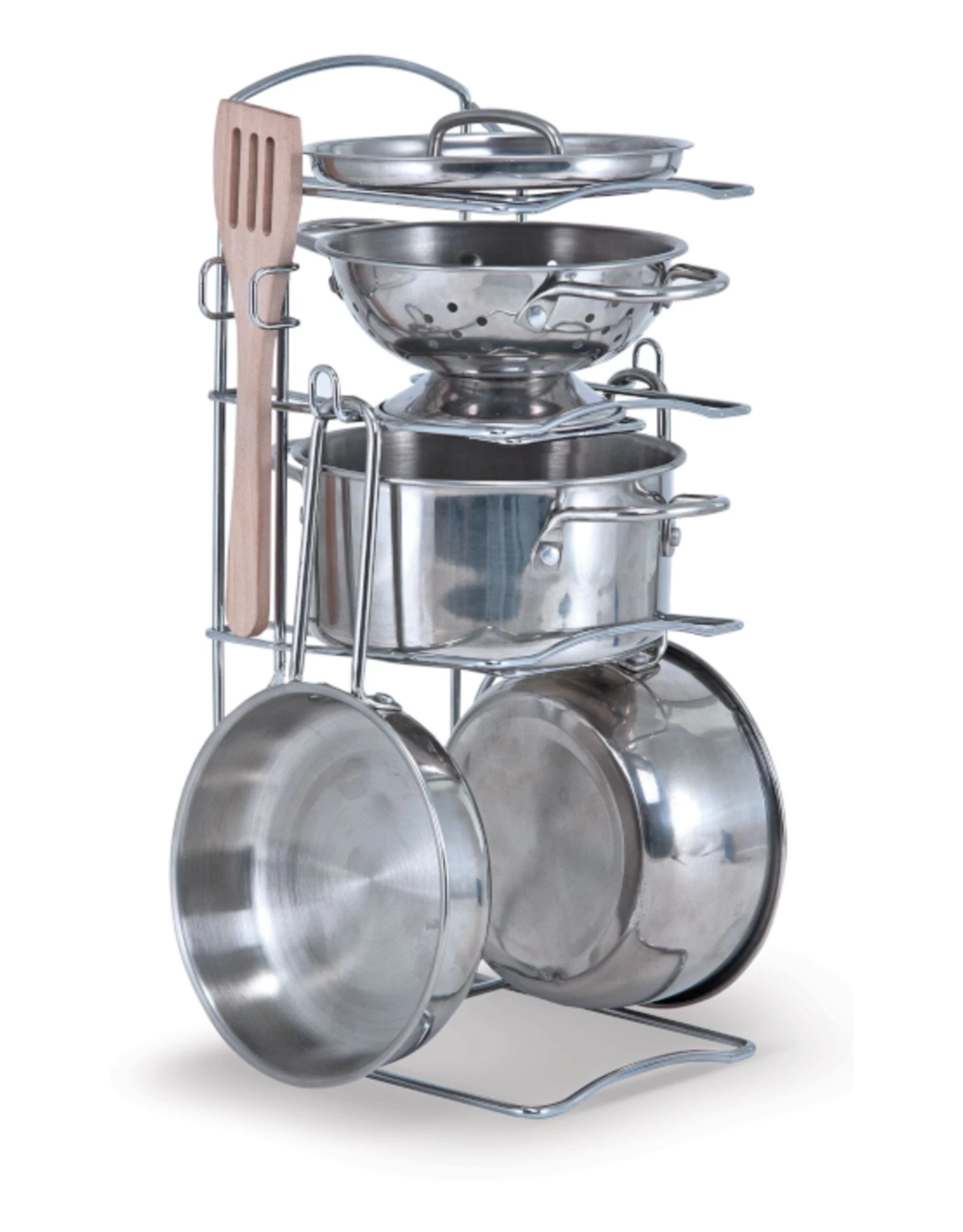 This play set features shiny stainless steel cookware Mom and Dad would envy! Generously sized (5-inch diameter) for a more realistic look and feel, the colander and three pans (with interchangeable lid) fit most play food items for exciting restaurant and kitchen play, and store neatly on a convenient storage rack when the kitchen is closed. All of the handles and knobs feature sturdy riveted joints that won’t weaken and wear like welding or glue. With two hardwood utensils included and stainless steel pieces polished to a gorgeous mirror-finish, this set is truly top shelf!