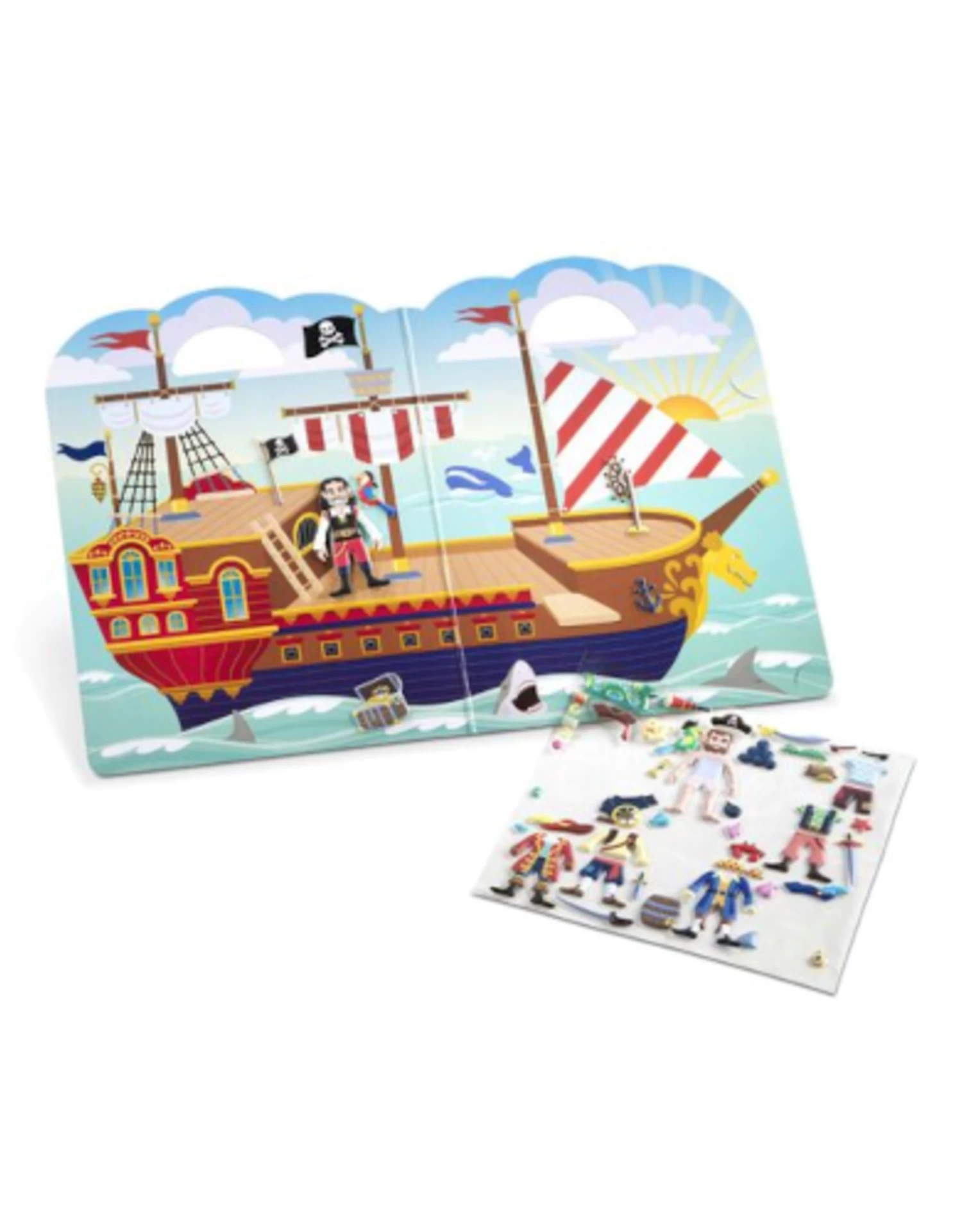 These reusable puffy stickers are filled with swashbuckling appeal! Pick your pirate stickers and layer on some seaworthy duds to build your characters and launch a tale of peril and adventure. It’s easy to keep the story sailing at a thrilling clip: Just layer the puffy stickers onto the double-sided background board to fill a pirate ship or desert island with buccaneers, then add treasure, sea creatures, hooks, cutlasses, daggers, and more to fill in the scene. Ready to jive-ho? It’s easy to lift, switch, layer, and rearrange it all to depict whatever pirate adventures a child can imagine! A built-in sticker collection–51 reusable puffy stickers in all–offers endless opportunities for kids to express their creativity and have lots of pretend-play fun, all while improving fine motor skills and communication. It’s great for travel, too: The sturdy background board (with built-in handle!) folds to neatly store it all away.