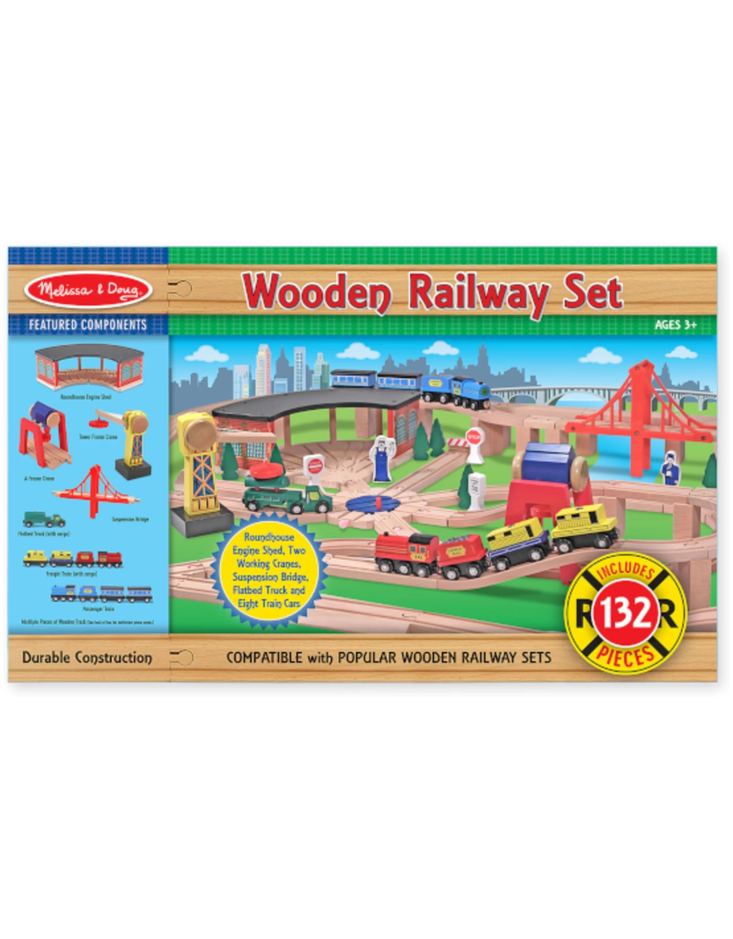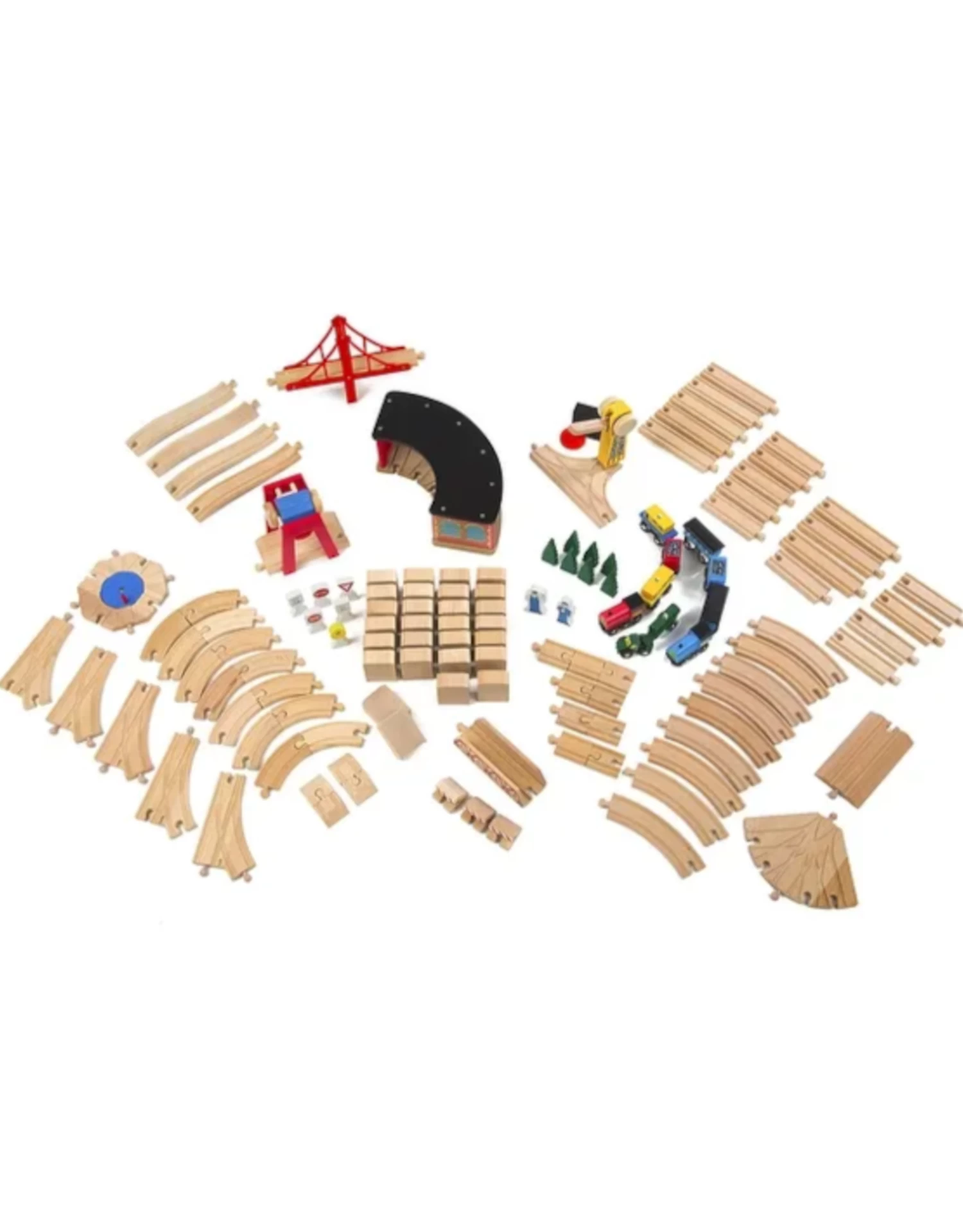 This amazing wooden railway set includes everything needed for budding train enthusiasts: a spacious roundhouse engine shed, dozens of track pieces in curves and straights, trees, workers, traffic signs; multi-piece trains; magnetic-tipped cranes; switches and a T-junction for changing course; suspension bridge, trestle bridge, and roundtable, too! With more than 130 pieces, it’s a tremendous value! Mix and match with other train sets–it’s compatible with all popular wooden railway systems.