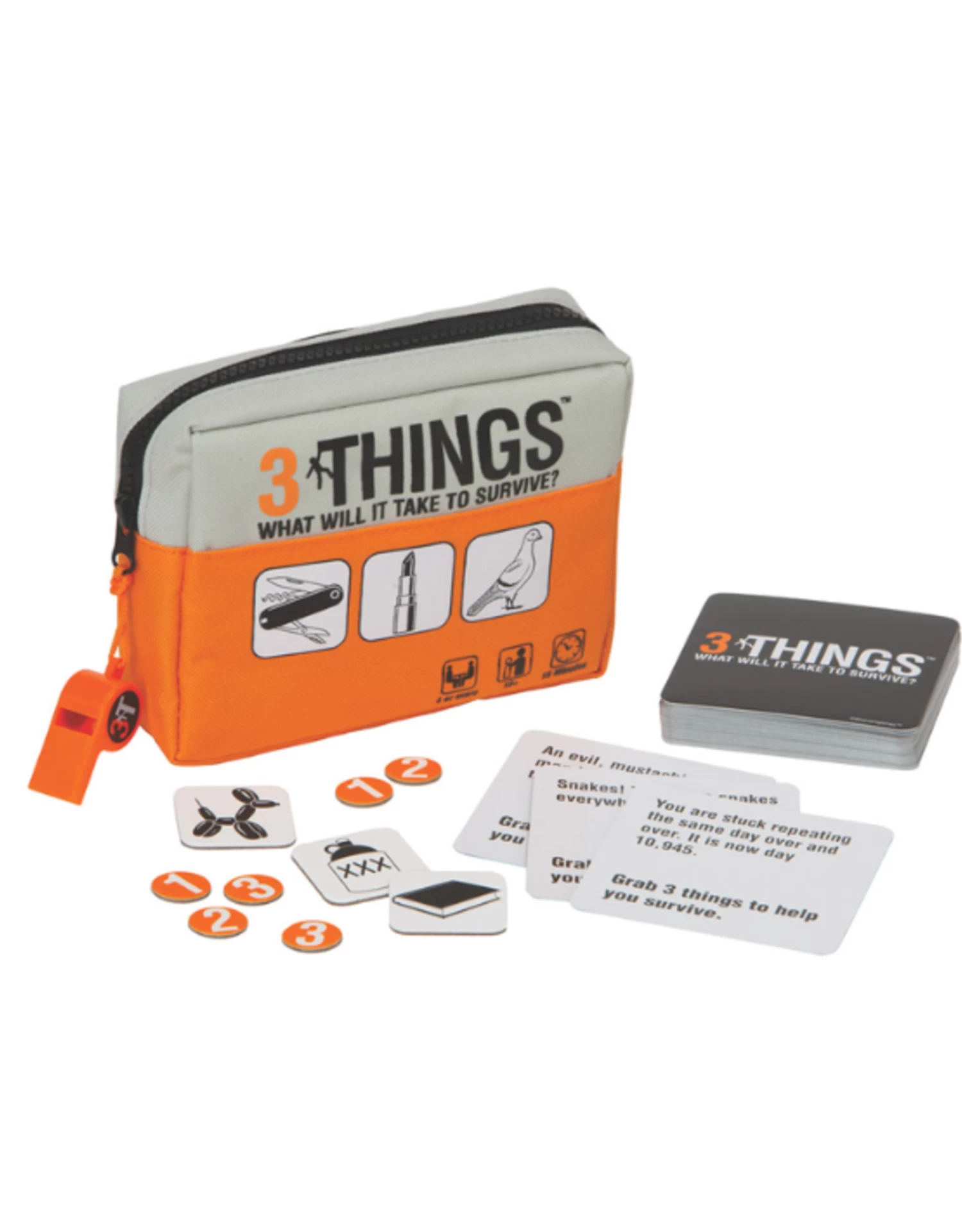 You’ve got 30 seconds and 80+ random objects to choose from. Can you figure out a way to get through a crazy survival scenario? Think quickly to piece together your plan before making your case to the judge. It better be good; there are only so many rations that you can win and you never know what your fellow competitors have up their sleeves. 3 Things is a witty game of ridiculous persuasion, perfect for your most creative group of friends.