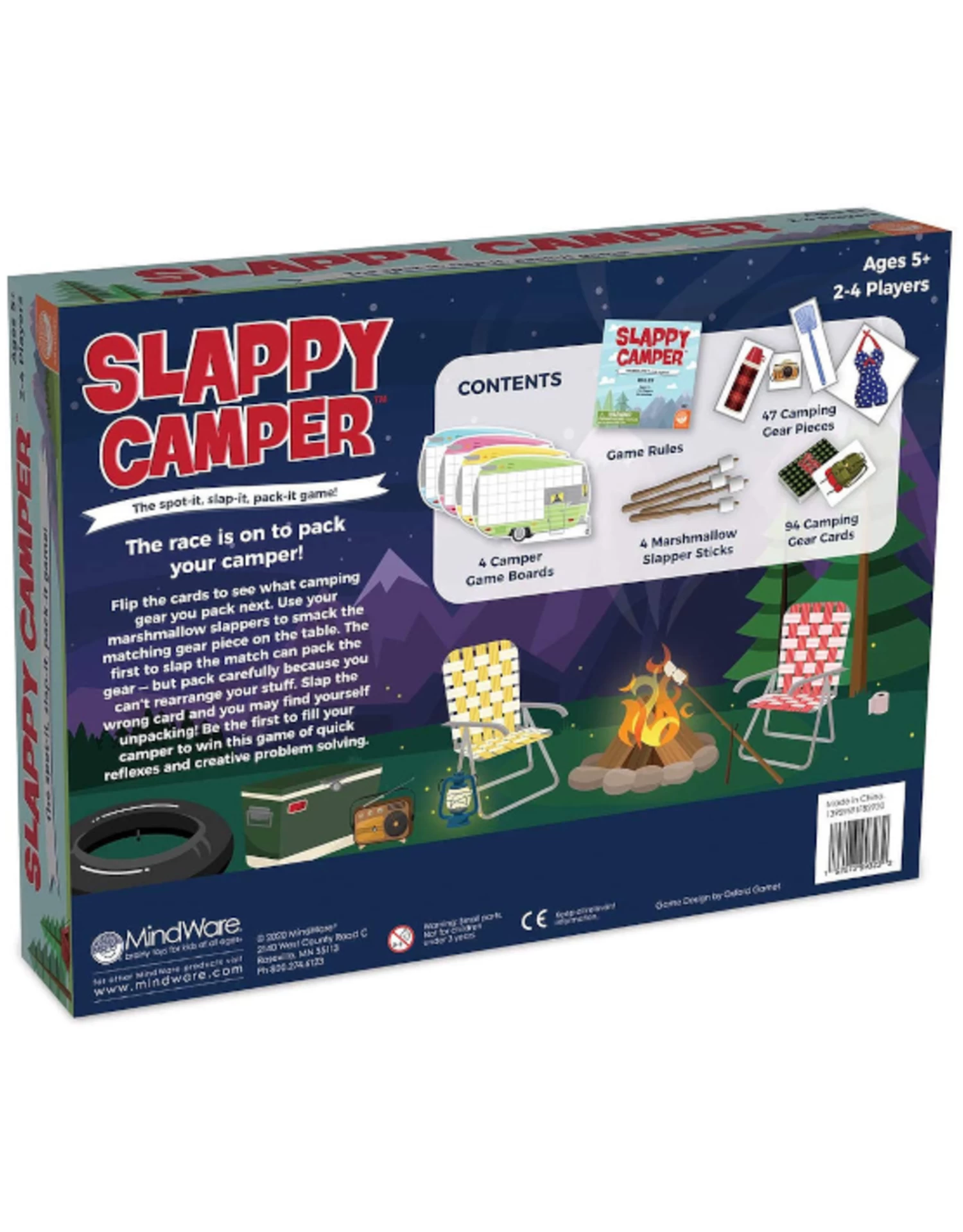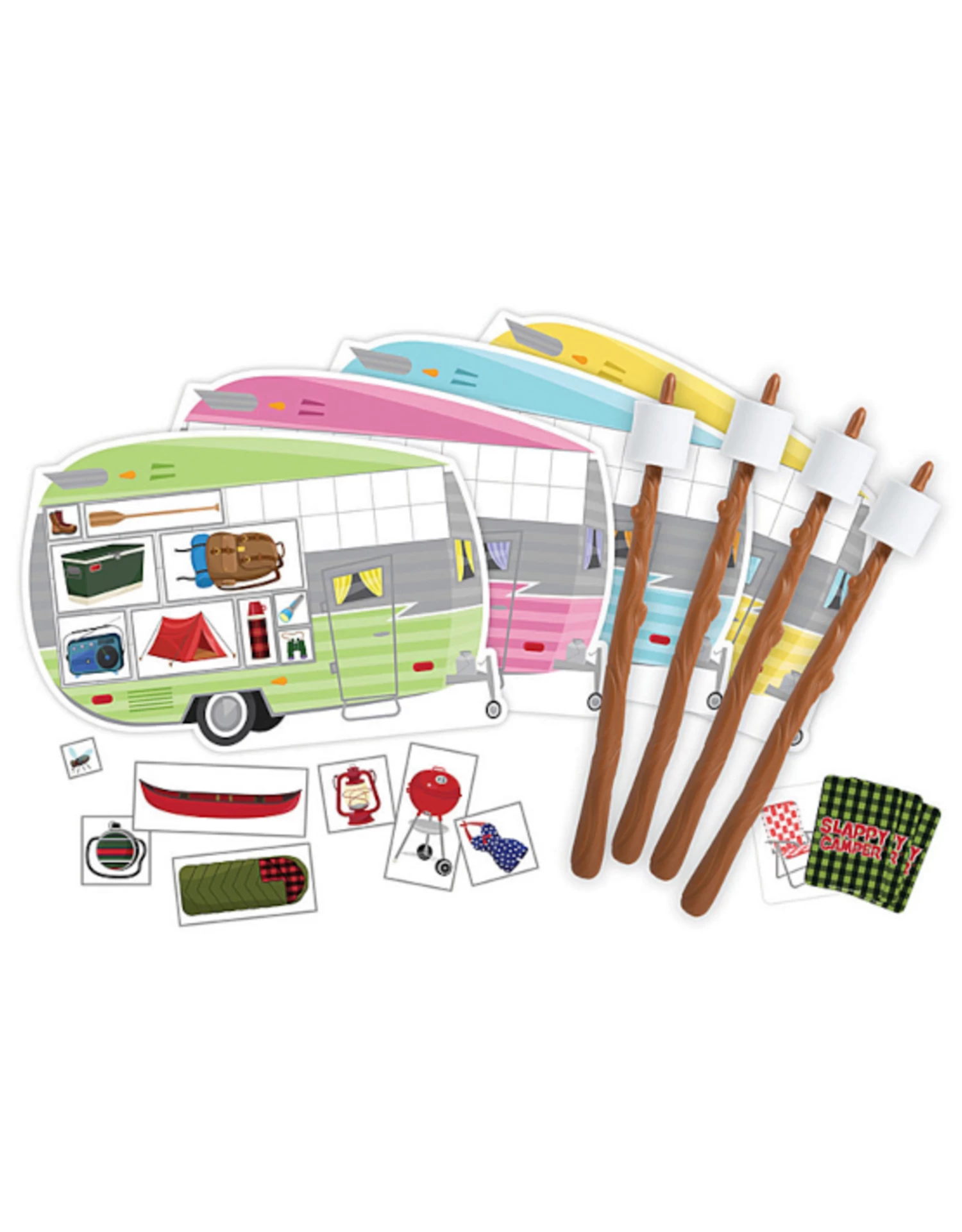 Includes 4 camper game boards, 4 marshmallow slapper sticks, 47 camping gear pieces, 94 camping gear cards and instructions