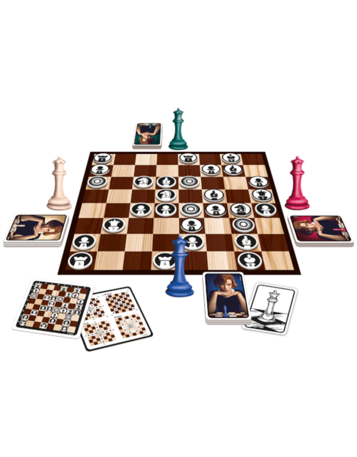 In The Queen’s Gambit, you can try to outwit your fellow players by playing with as much foresight as she did. Each of the 2-4 players has their own gambit piece that moves across the chessboard, and your turns are always planned three moves in advance by laying down cards upon which chess pieces are depicted. On your turn, you reveal your first card; move the gambit piece according to what’s depicted on that card, ideally capturing chess tiles in the process; then refill your row by placing a third card in your personal queue.