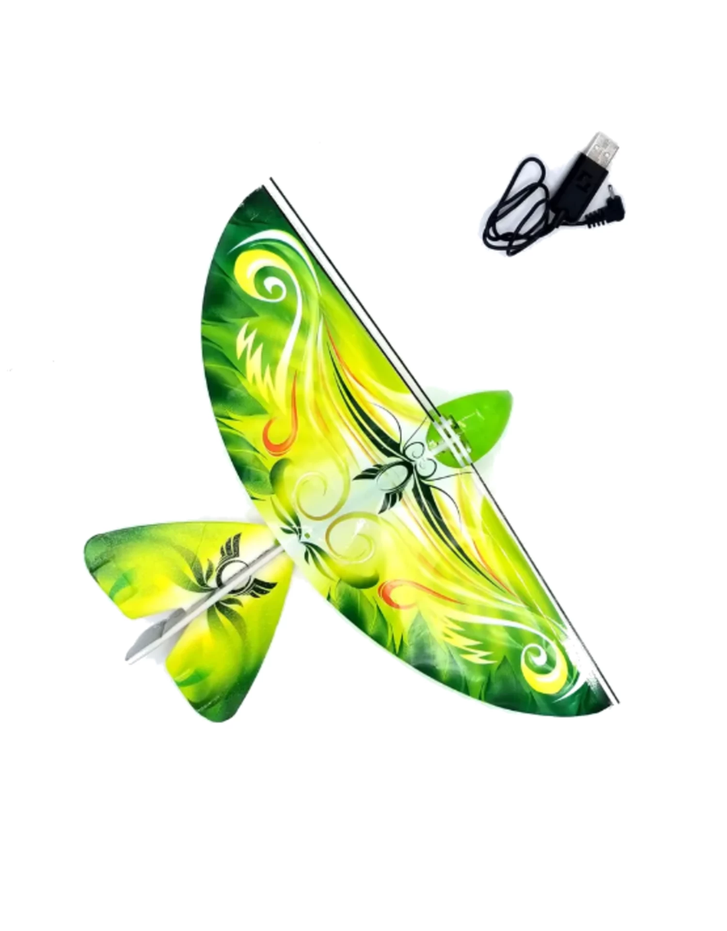 The self-fly bird set includes a green parrot drone and a USB cord; no RC needed! The bionic bird robot that flaps wings to fly like a real bird. 20 minutes charging for 20 minutes flying.