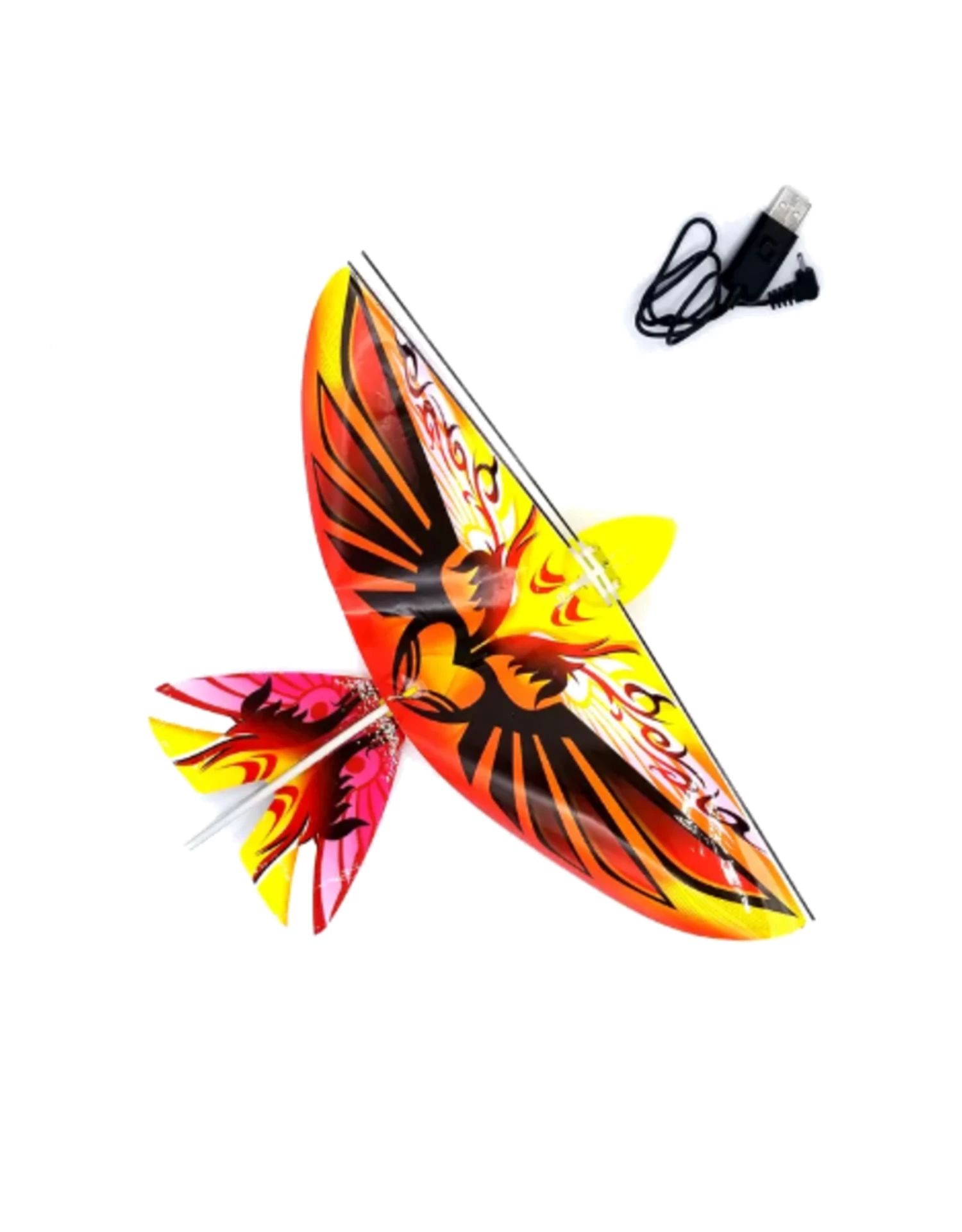 The self-fly bird set includes a orange phoenix drone and a USB cord; no RC needed! The bionic bird robot that flaps wings to fly like a real bird. 20 minutes charging for 20 minutes flying.