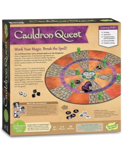The object of Cauldron Quest is to get the three correct ingredients into the Cauldron before all six of the paths are blocked. The evil Wizard has cast a spell to destroy the kingdom! You have the power to create a potion to break the spell, but you must work together. Your quest is to find the three correct ingredients hidden under the potion bottles and move them up the paths and into the Cauldron before the Wizard blocks all of the paths. If you do not get all three potion bottles with correct ingredients to the Cauldron before the paths are blocked, the Wizard triumphs and the kingdom is destroyed.