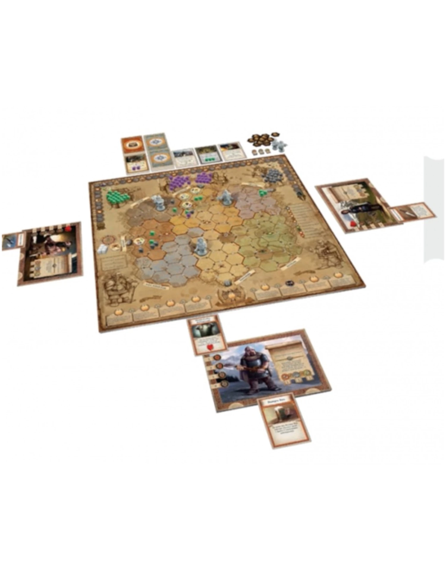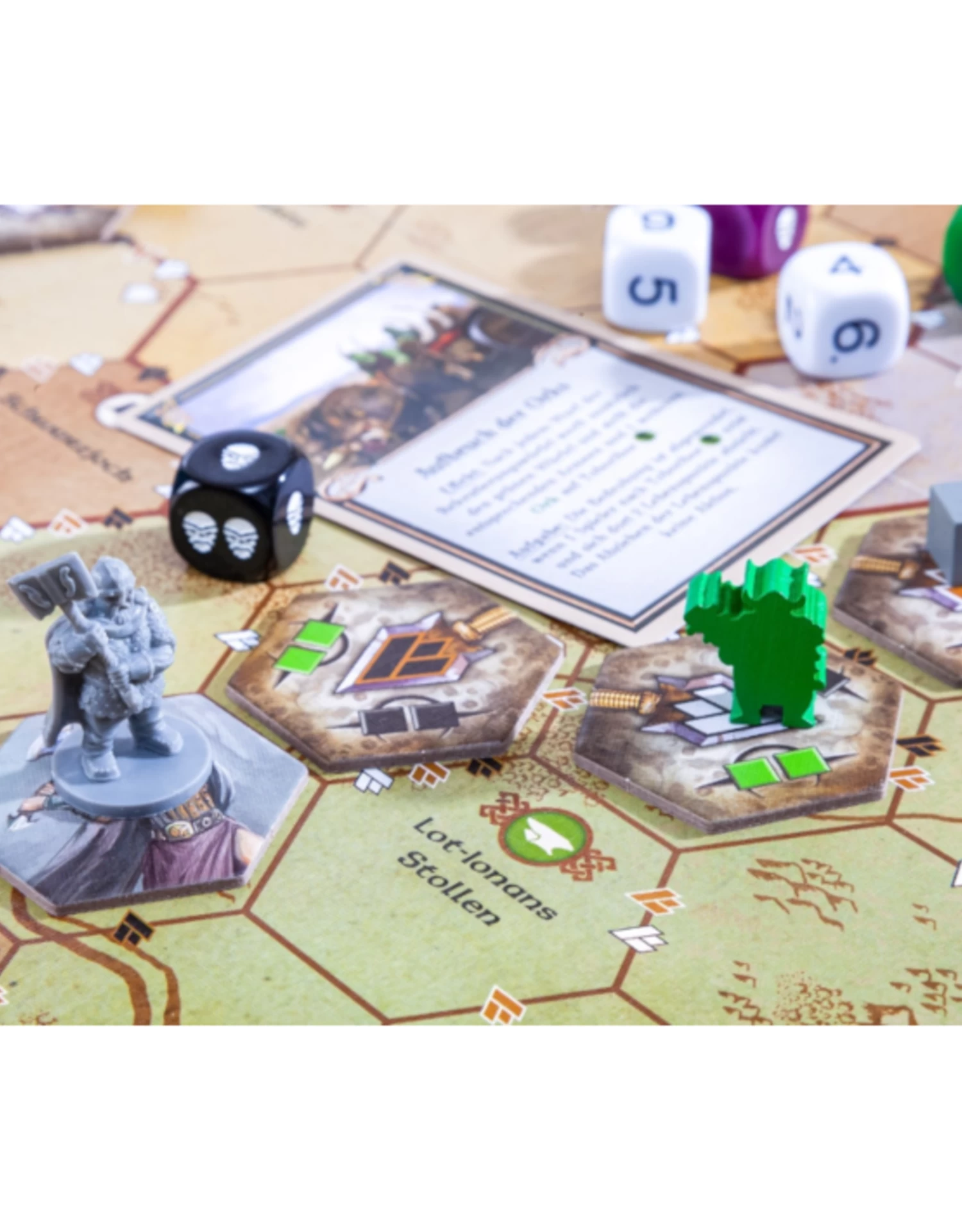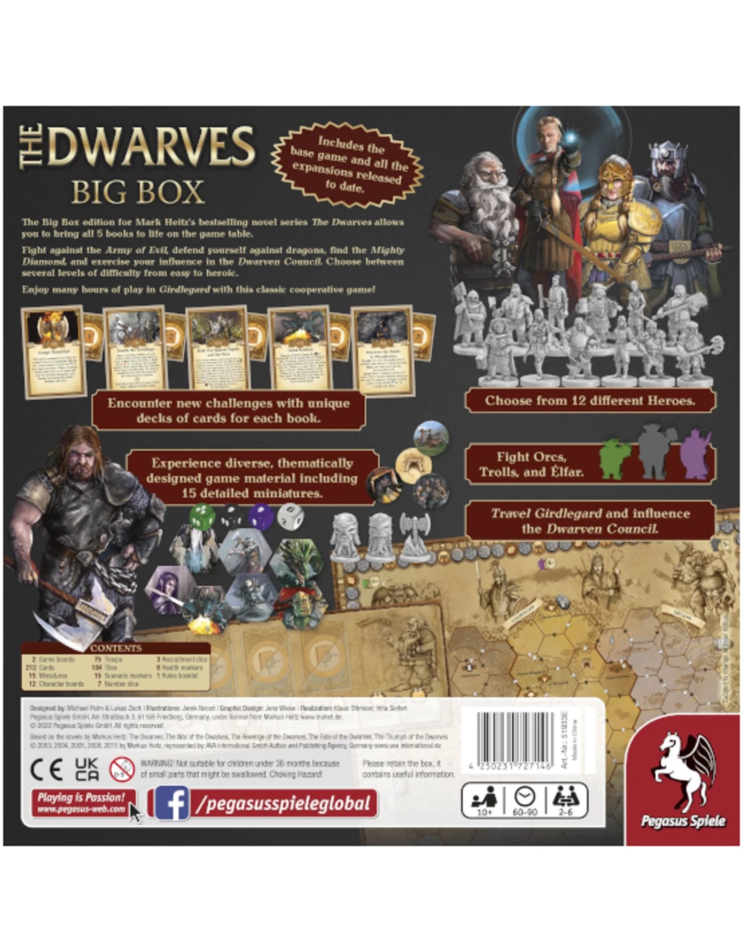 The Dwarves face the dark threat of Orcs, Trolls and Älfar. To defeat evil they have to join forces and coordinate their actions. Based on the series of novels by Markus Heitz, the cooperative game for 2 to 6 players aged 10 and up throws players into various scenarios, in which they have to spend their action points wisely each turn, to gather equipment, fulfill missions, use their special abilities, travel the country and fight back the ever-advancing menace before their land succumbs to darkness.